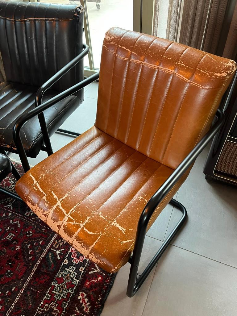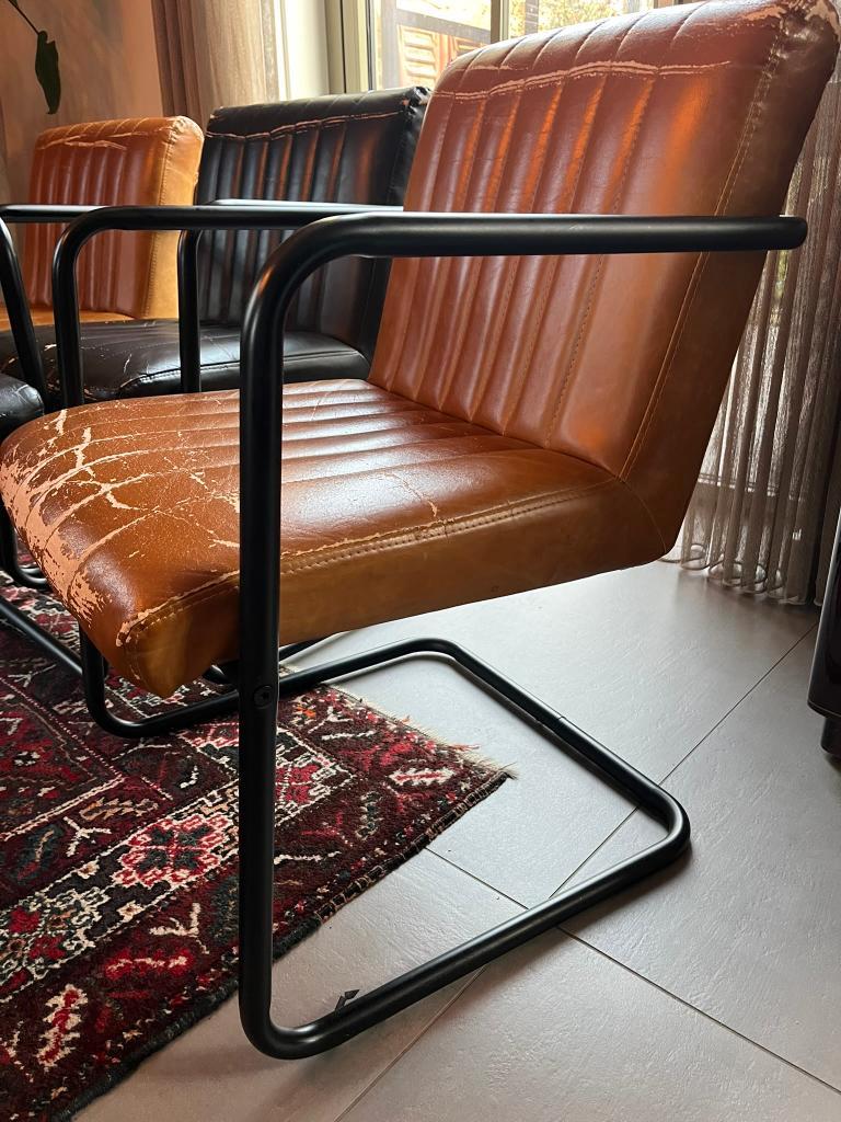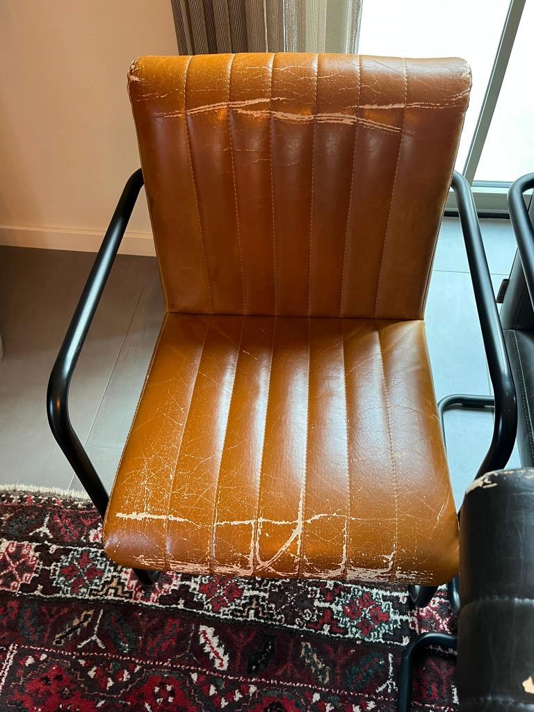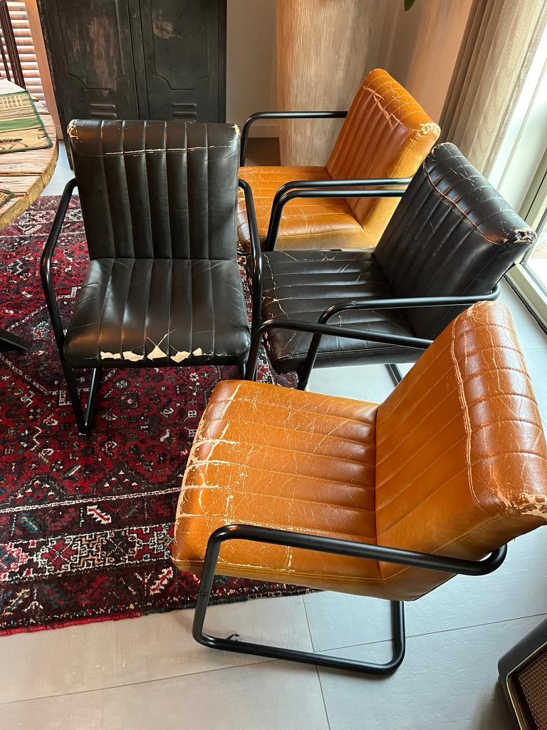 Wij krijgen nieuwe eetkamertafelstoelen dus deze mogen weg. Zoals te zien op de foto''s zijn ze versleten maar ze zitten nog prima en het zwarte frame ziet er nog wel tof uit, bijna geen slijtage.
