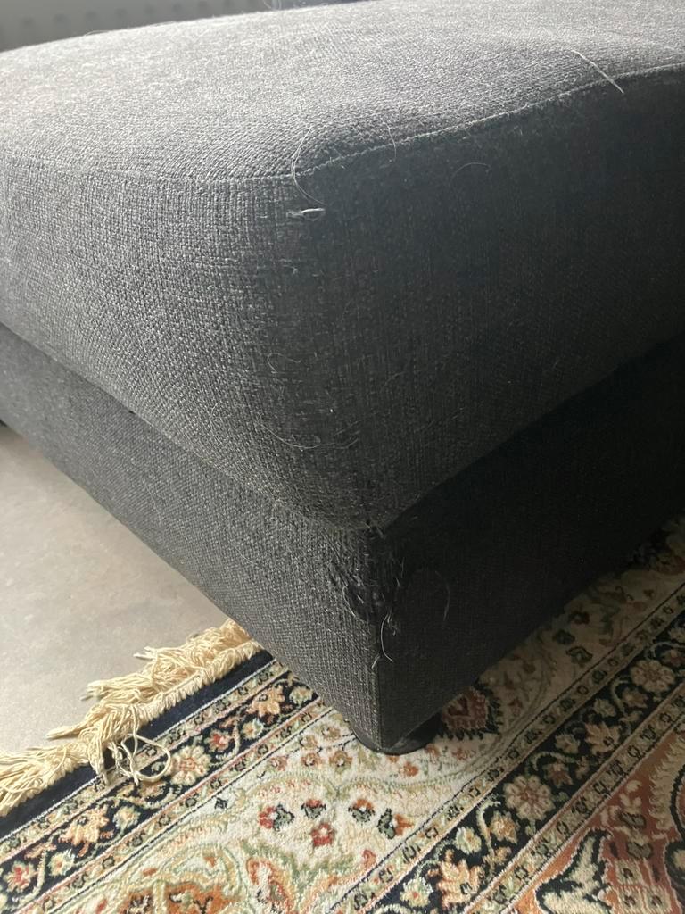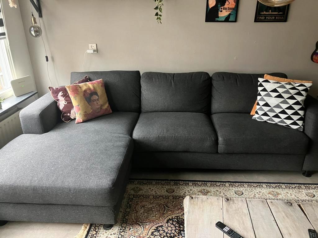Gratis ophalen, hoekbank donker grijs, in prima staat wel wat beschadigingen op 2 hoeken van de kat. 2.70 Breed in totaal en de hoek is 1.60 Lang.