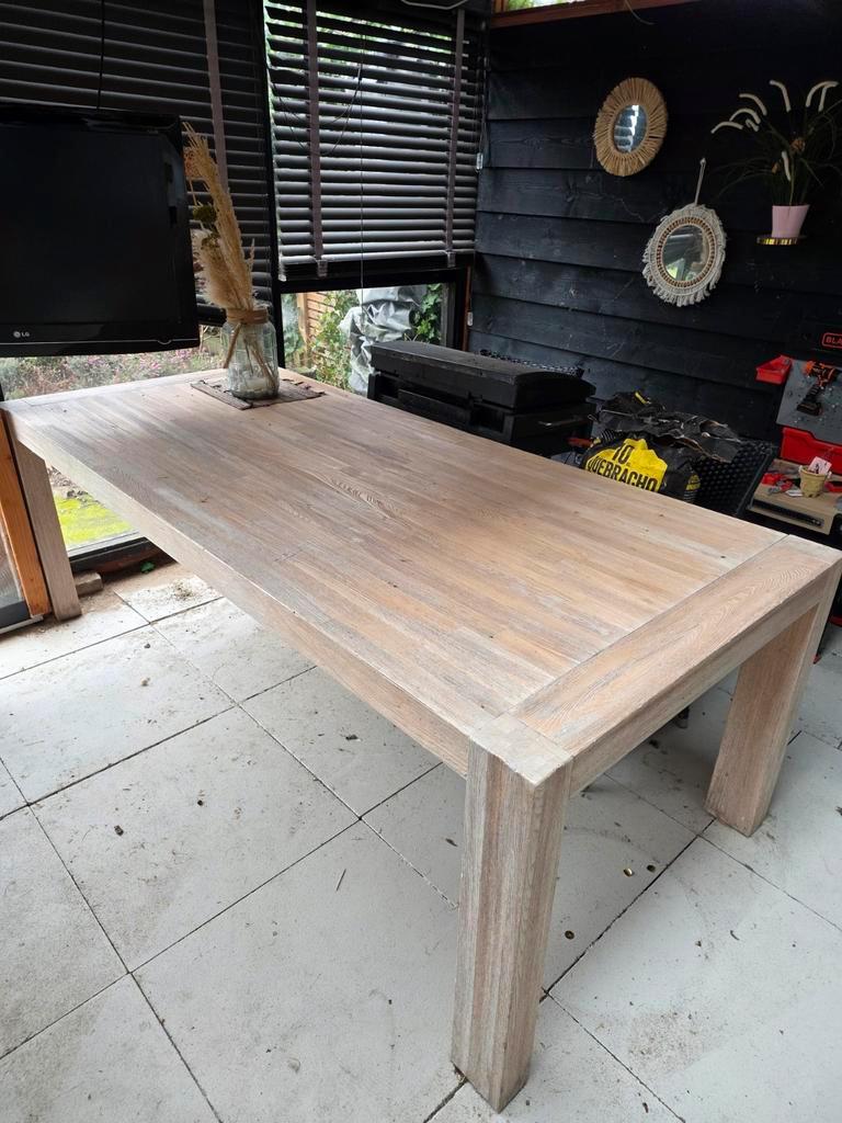 Prima tafel, gratis op te halen tot en met aanstaande donderdag. De afmetingen zijn 226cm bij 100cm. Oorspronkelijk een tafel voor binnen, maar bij ons buiten onder de serre gestaan. Heeft uiteraard w