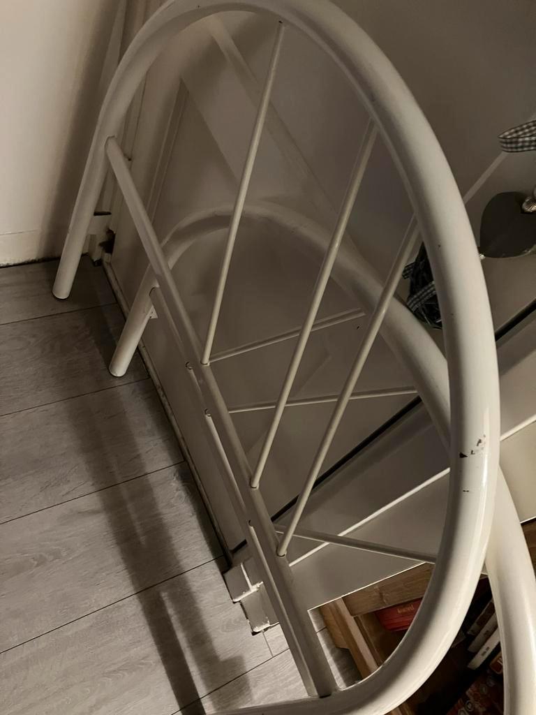 1 persoonsbed metalen frame met lattenbodem en matras.