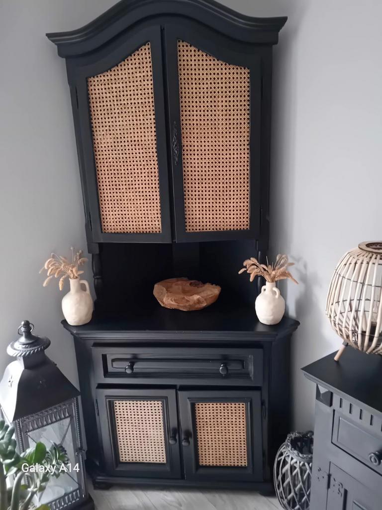 Deze hoekkast is een stijlvolle toevoeging aan elk interieur. De kast is voorzien van deuren en planken, waardoor er voldoende opbergruimte is. Het materiaal is van hoge kwaliteit en de kast is in goe
