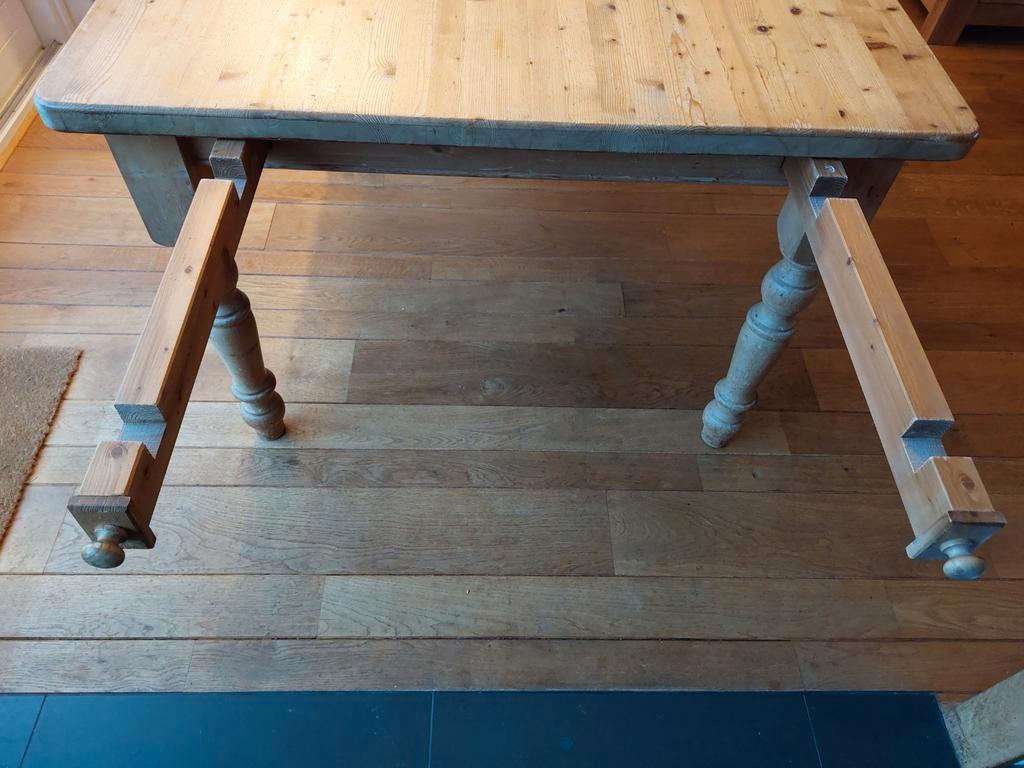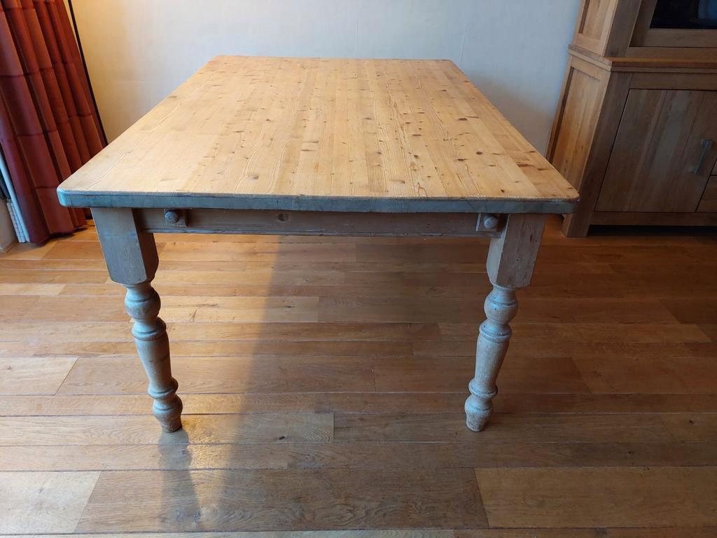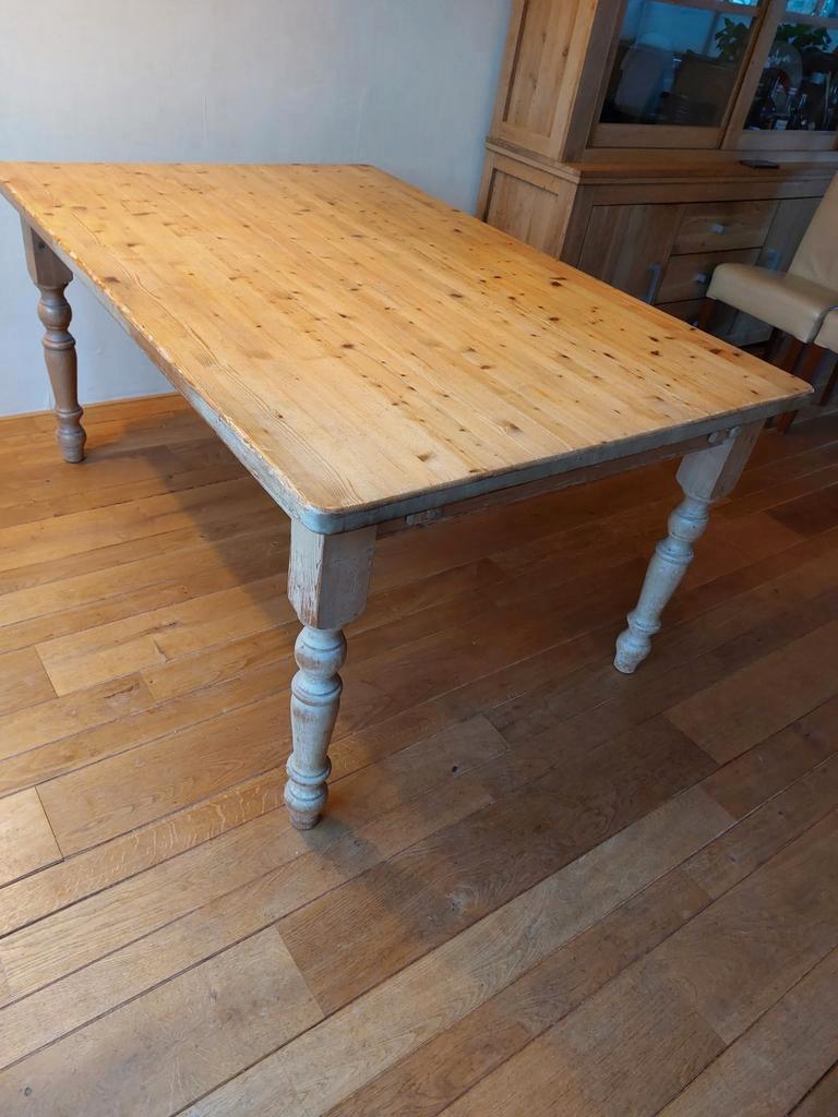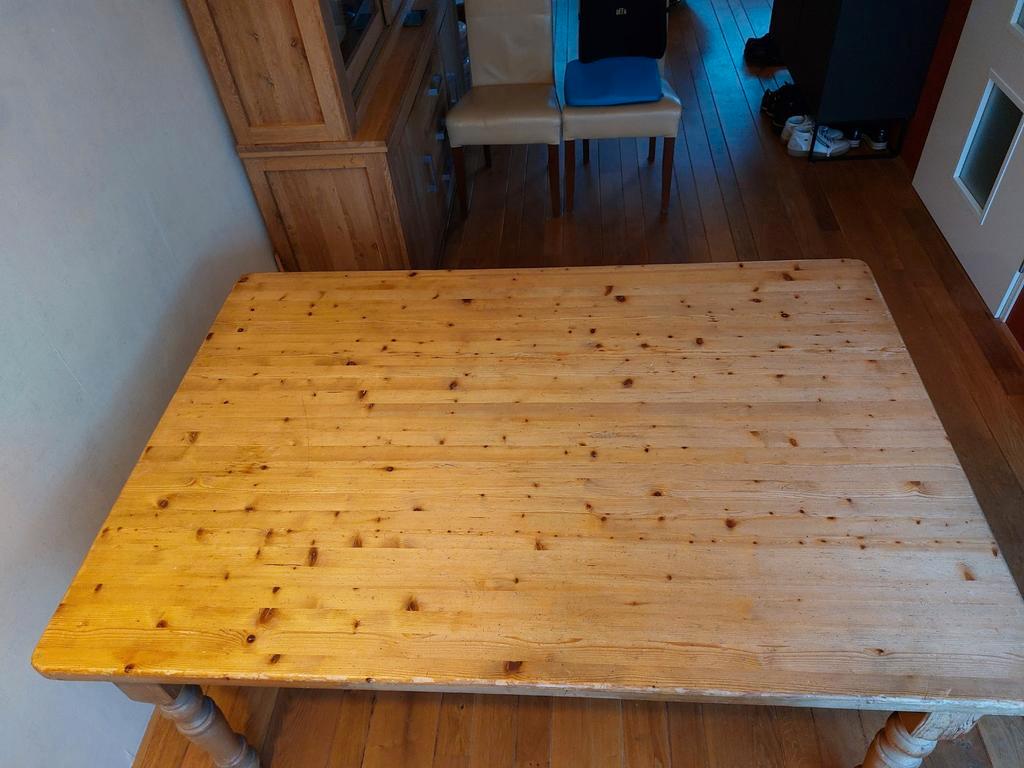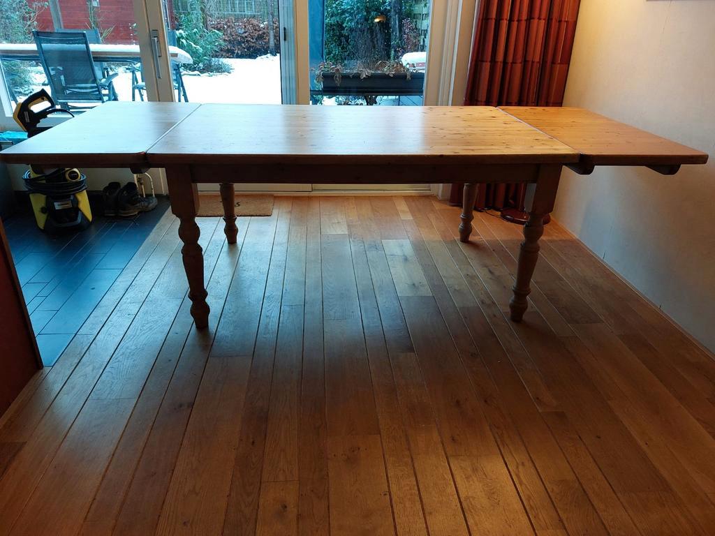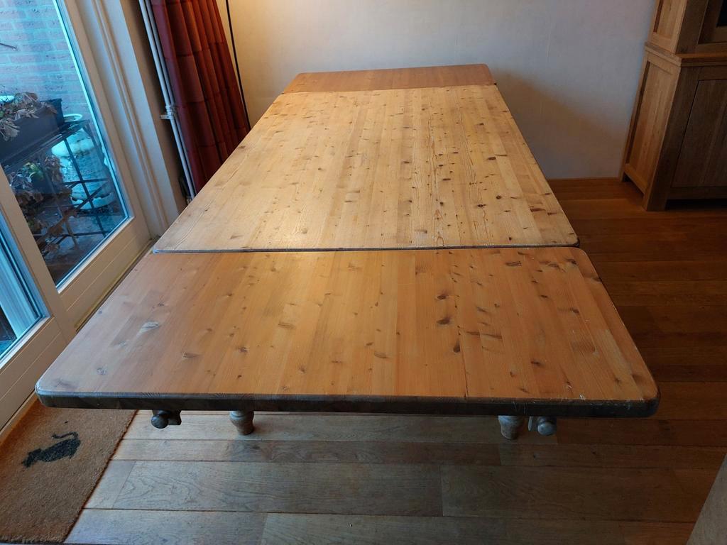Tafel (massief grenen) met extra bladen. Lang 160 cm, met aanzetstukken 210 cm breed 110 cm, hoog 78 cm je kunt er makkelijk met 10 aan zitten, met wat kunst en vliegwerk ook met 12. Heeft wat tlc nod