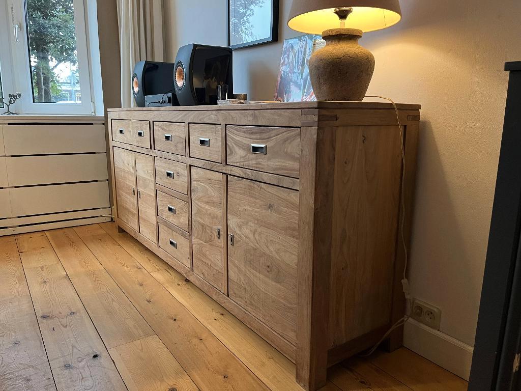 Te koop: grote, stijlvolle massief oakhouten dressoir / ladekast, gemaakt van premium oakhout. Hoogwaardige afwerking, warme natuurlijke houttinten en een tijdloos ontwerp. Afmetingen: 210 cm (breedte