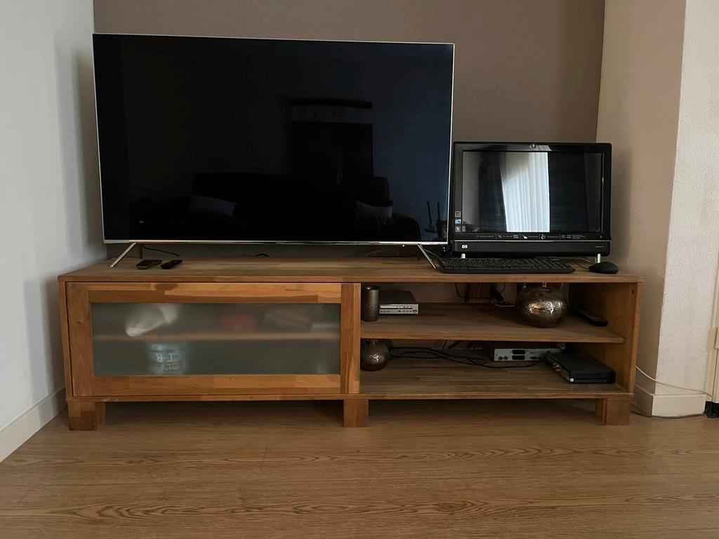 Mooi houten tv-meubel met veel opbergruimte. Het meubel is in goede staat en heeft een open vak en een vak met een glazen deur. Ideaal voor het opbergen van je tv accessoires en andere spullen. Afmeti