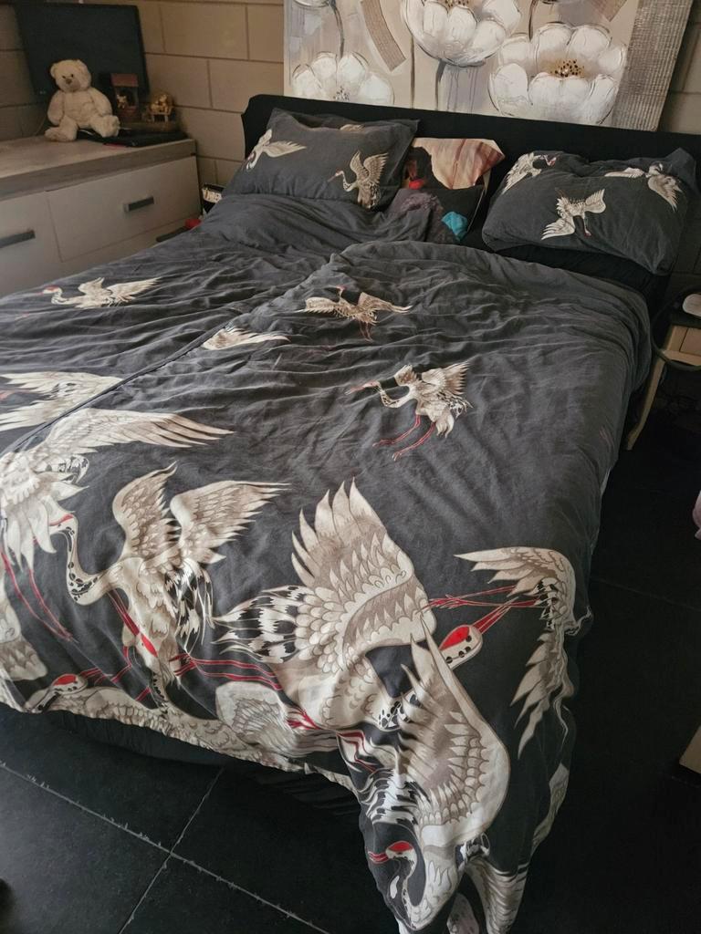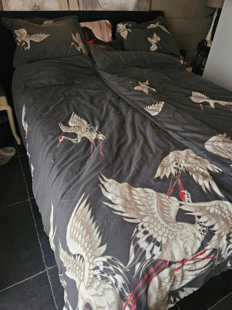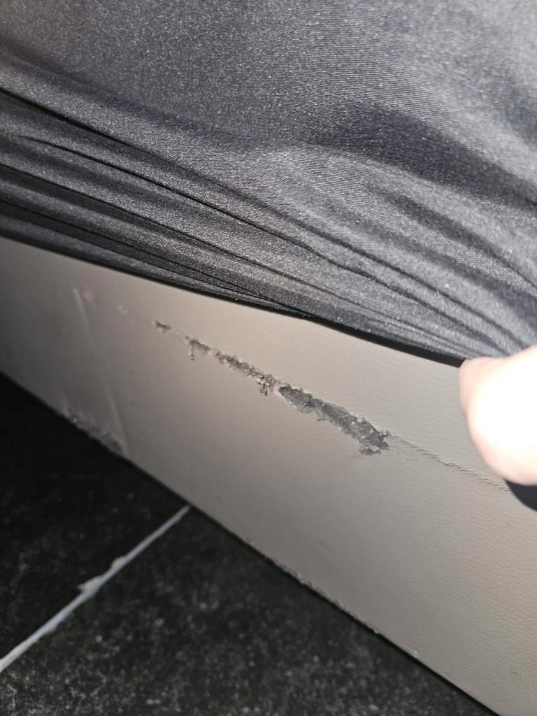 Gratis af te halen: 2-persoons boxspring met twee matrassen, een topmatras en een hoofdbord. De boxspring is bekleed met bruin kunstleer dat hier en daar beschadigd is. Er zitten zwarte hoezen omheen,