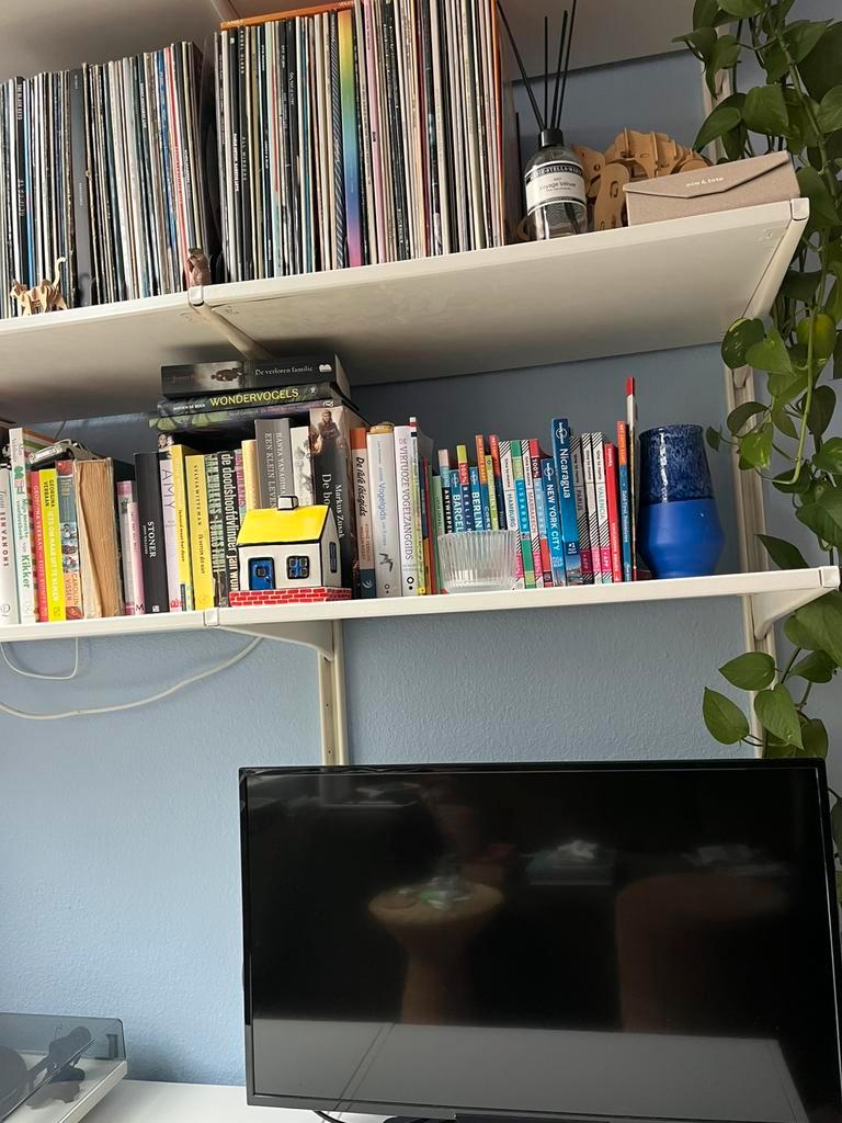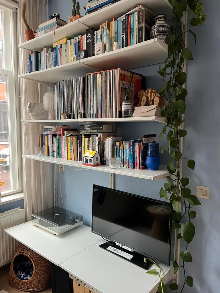 Wandsysteem type algot van ikea in gebruikte staat. Hier en daar wat beschadigingen en wat verkleuring. Op één plank een vlek, zie foto. Totale breedte: 145cm 4x planken 40x80cm 4x planken 40x60cm 1x