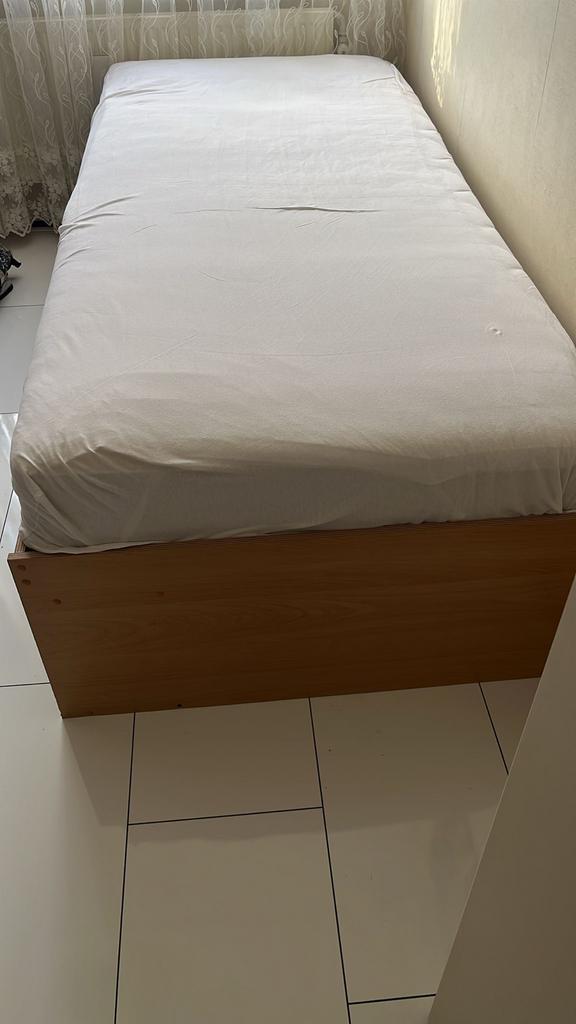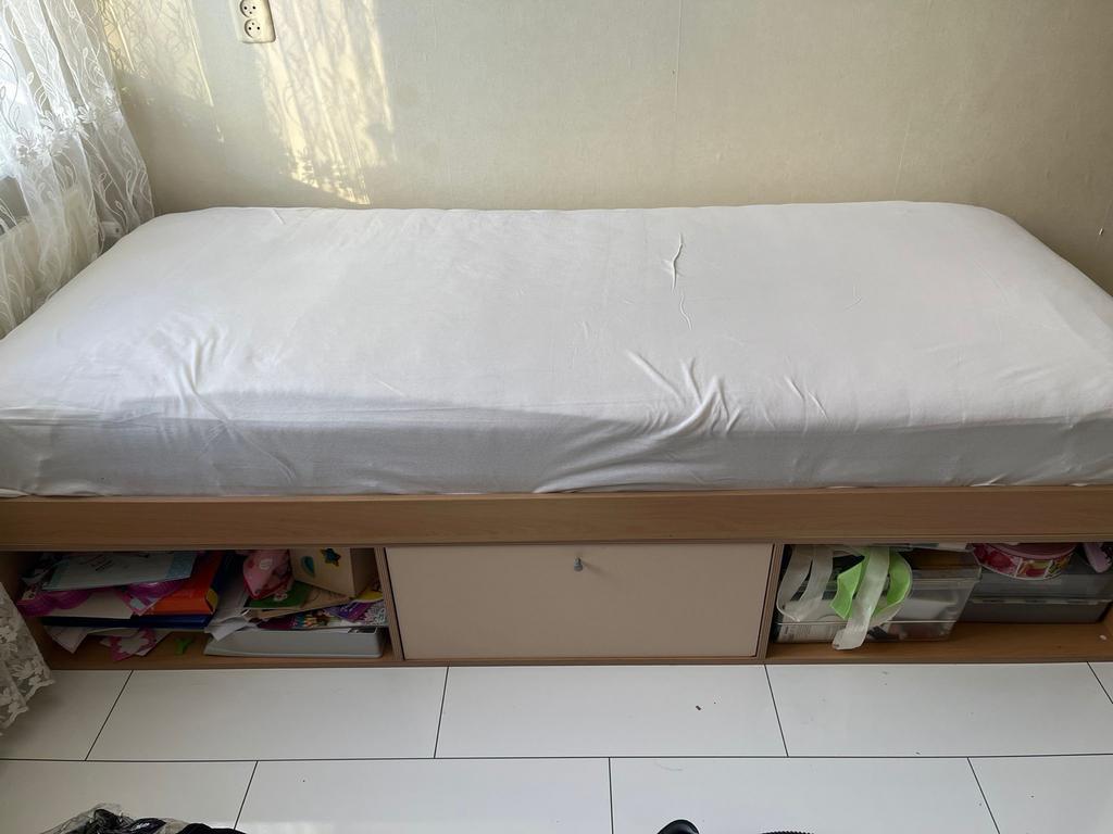 Eenpersoonsbed (90x200 cm) met handige opbergruimte onder het bed. Ideaal voor kleine ruimtes of voor extra opslag. Het bed is stevig en in goede staat. Let op: matras is niet inbegrepen.