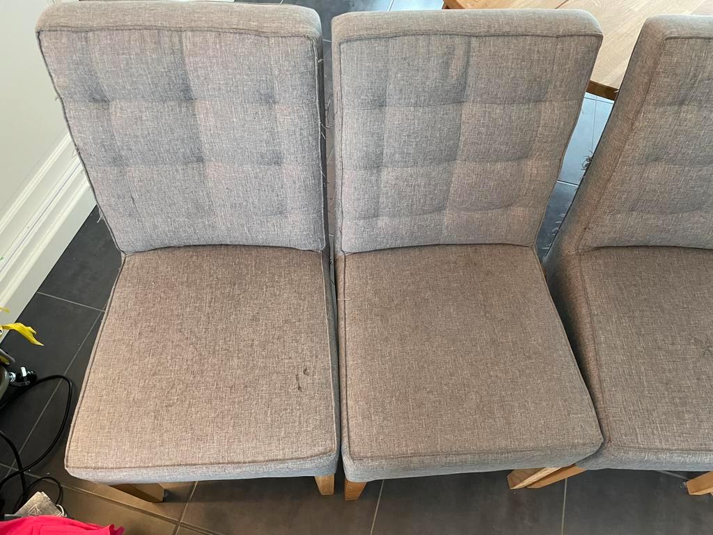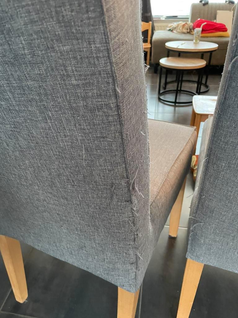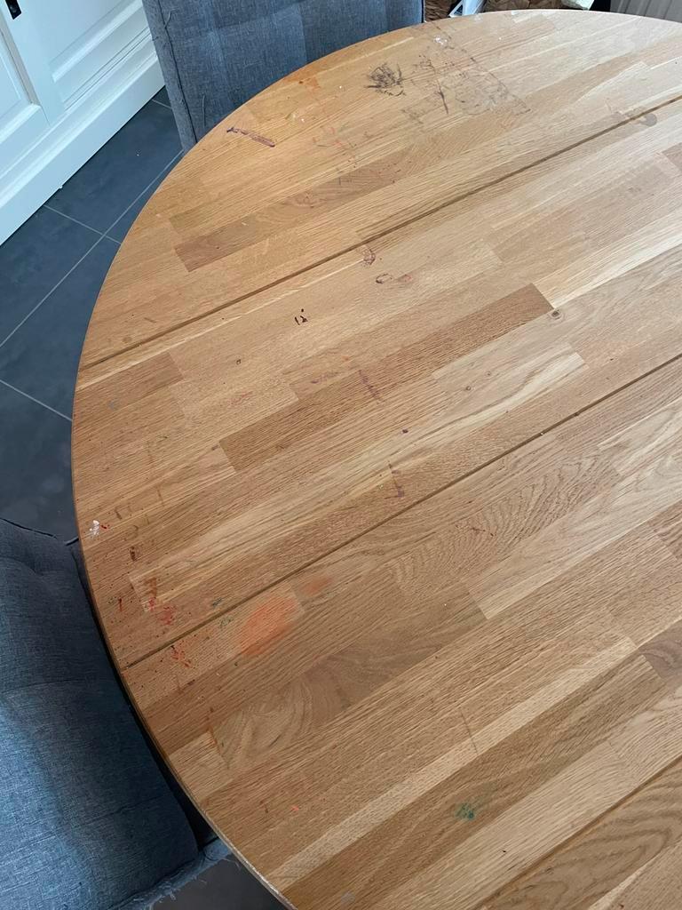 Ronde tafel van 1.20M doorsnee en 4 stevige stoelen. De tafel heeft vlekken en één van de poten wil niet meer vast. Hier moet extra bevestigingsmateriaal voor gebruikt worden. Met een likje verf wel w