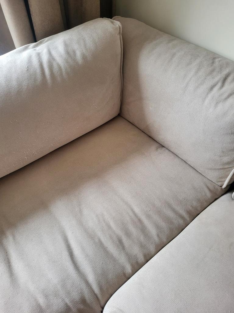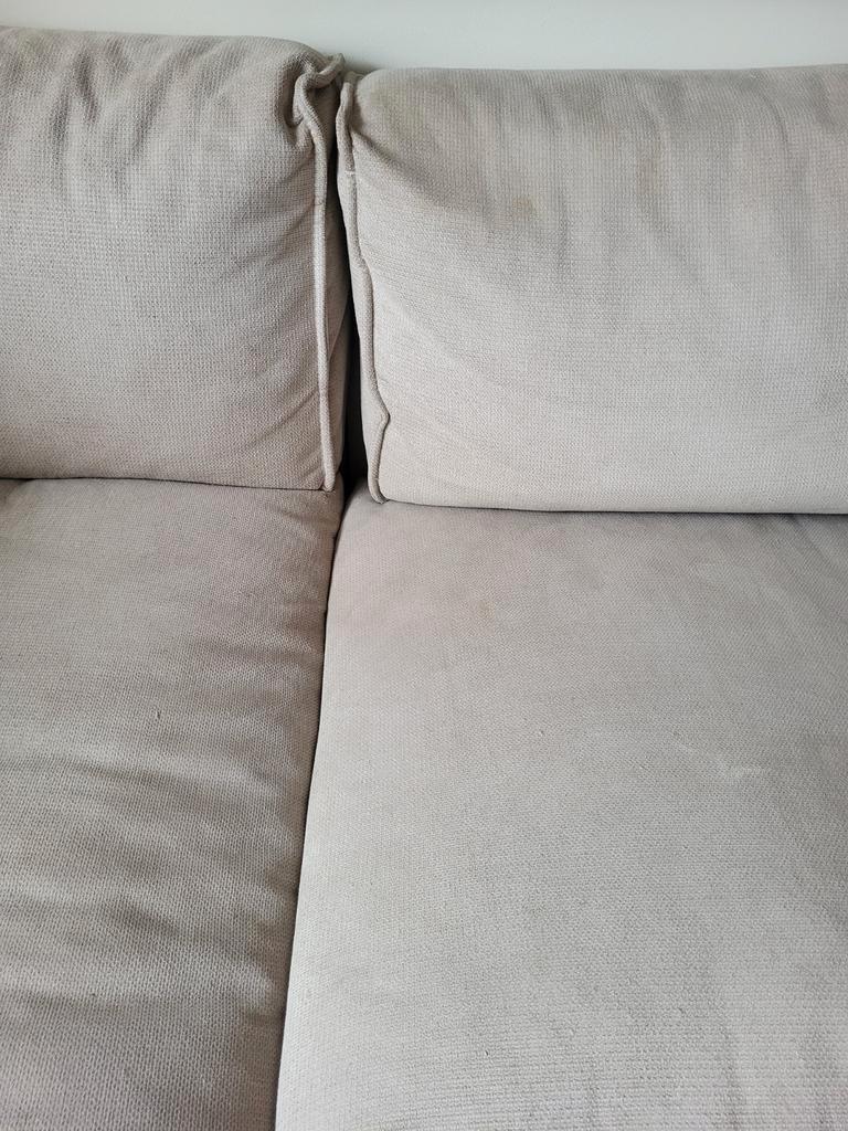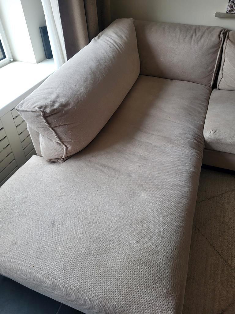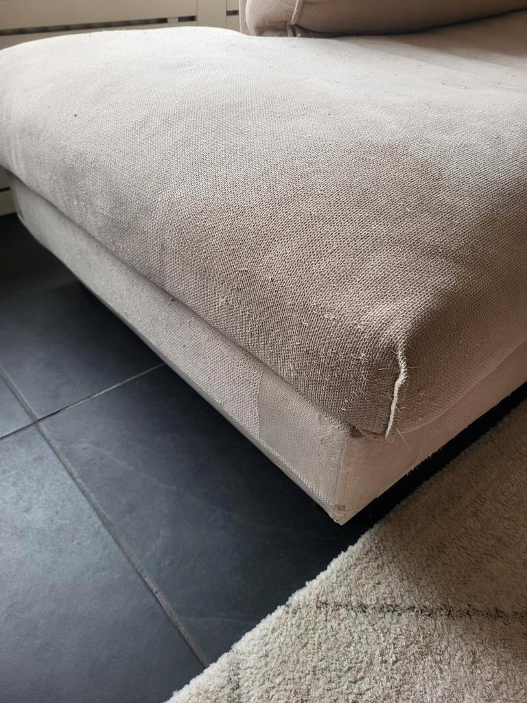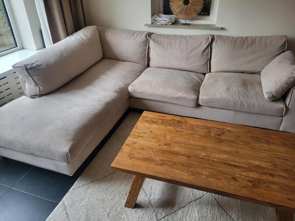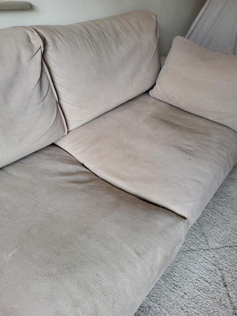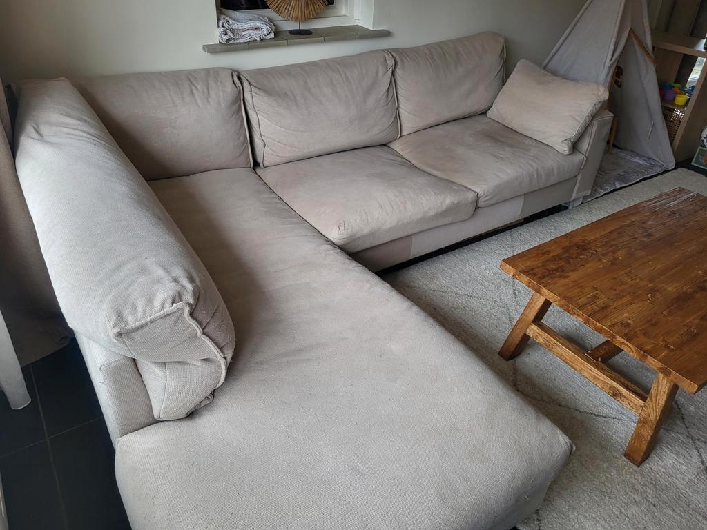 Gratis af te halen beige hoekbank, gekocht bij eijerkamp. De bank heeft slijtage door het krabben van katten en heeft wat vlekjes, maar is geïmpregneerd, dus de vlekken kunnen waarschijnlijk nog verwi