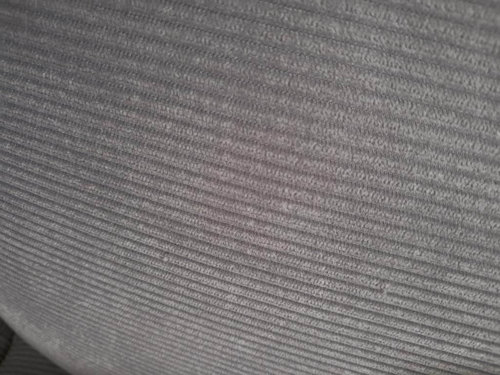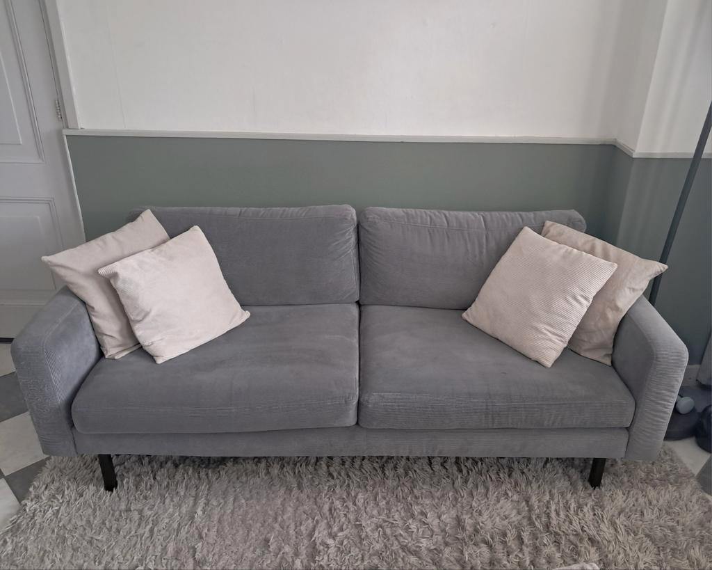 Grijze ribstof bank voor 3 personen. Bank is 200cm breed en zit nog heerlijk! Heeft gebruikerssporen maar kan prima nog een rondje mee. Zwart doek onderkant zit los en aan de zijkant wat beschadigd. G