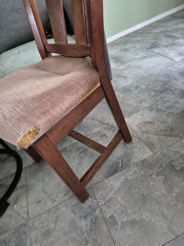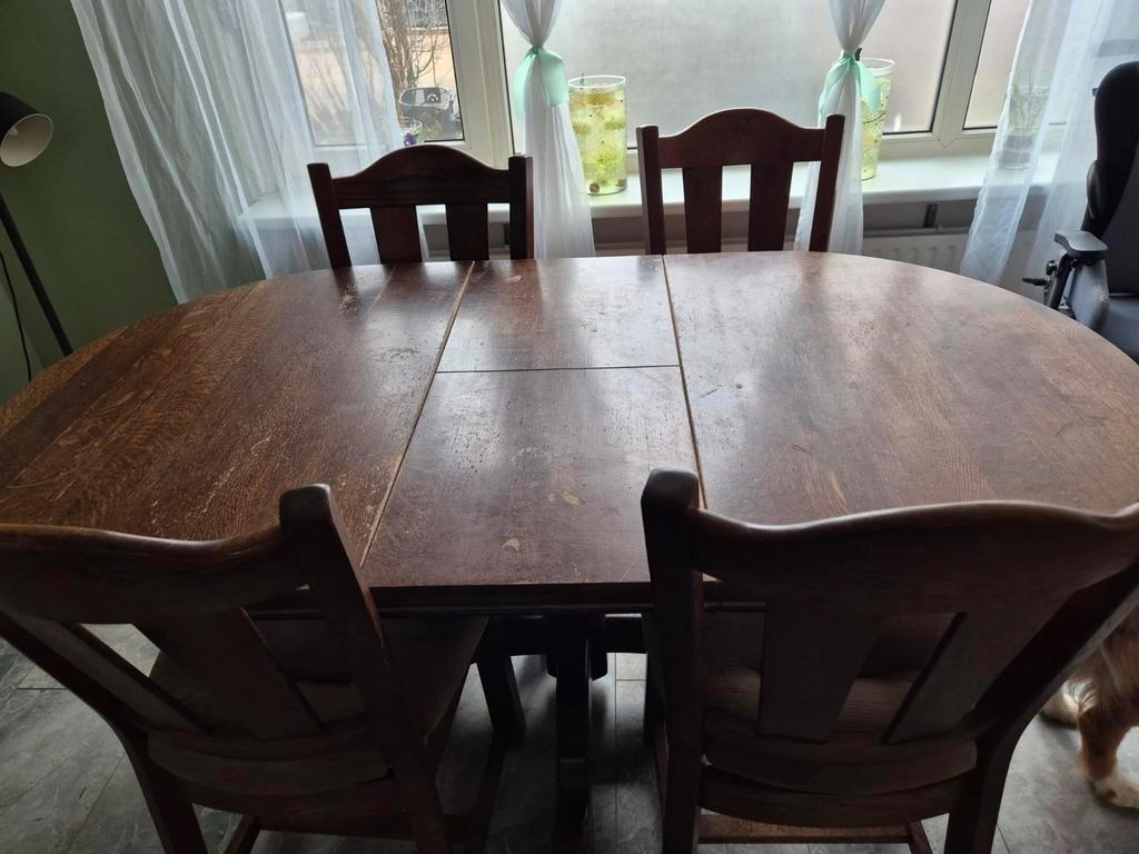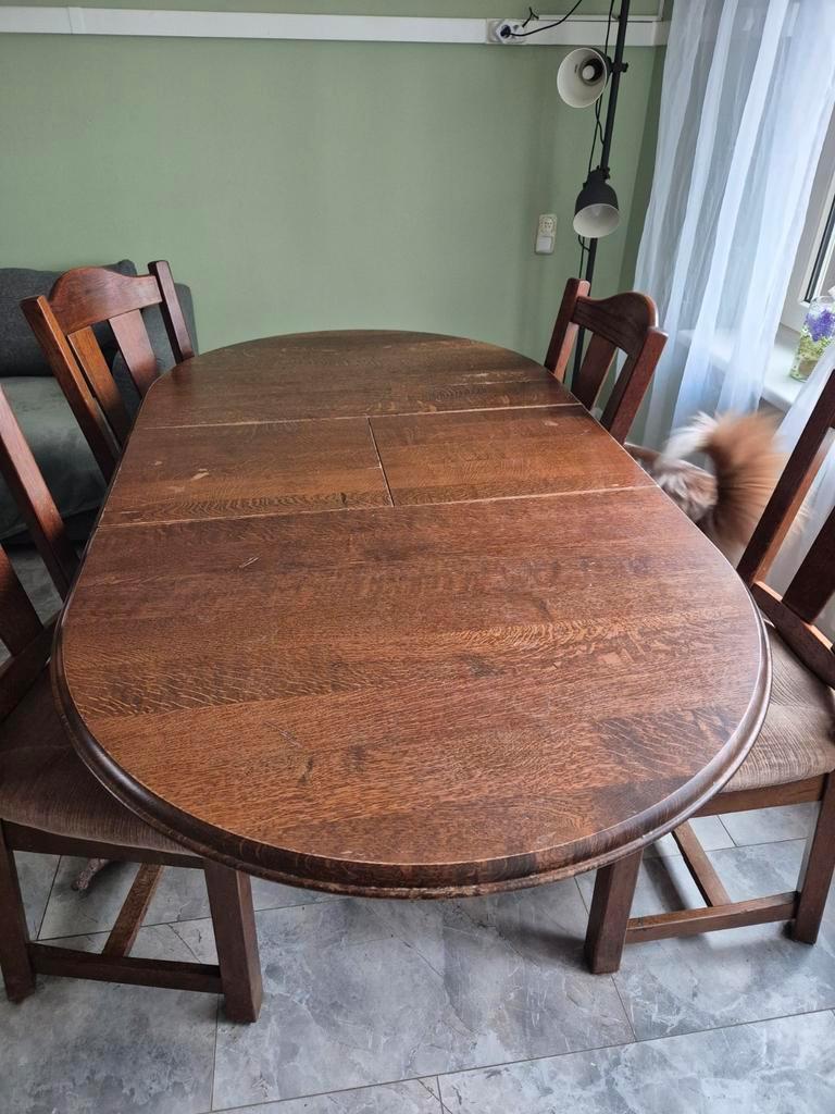 Donker eiken eettafel ovaal die uitschuifbaar is tot 170 cm lang en 100 cm breed. Er zitten 4 stoelen bij die wat aandacht nodig hebben. De tafel is in gebruikte staat, maar kan nog prima een ronde me