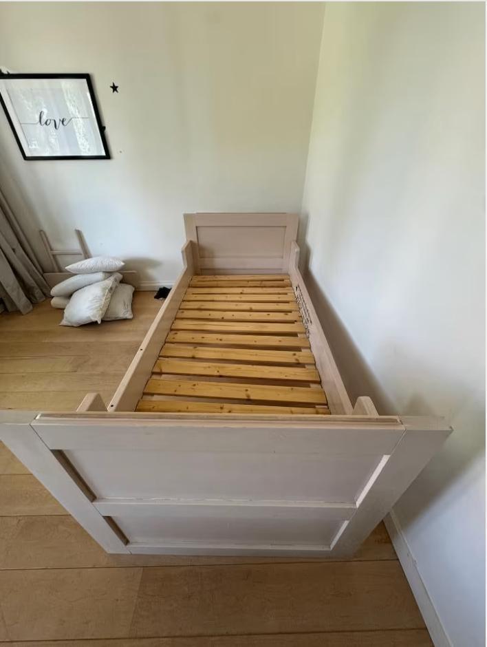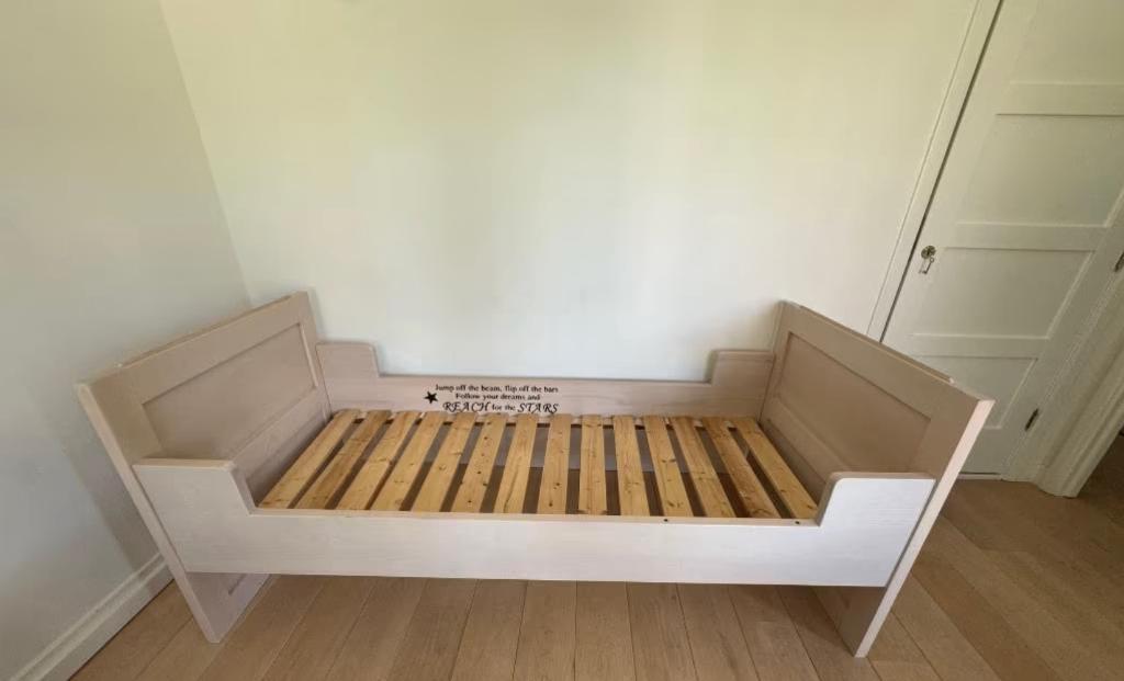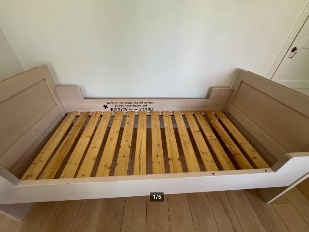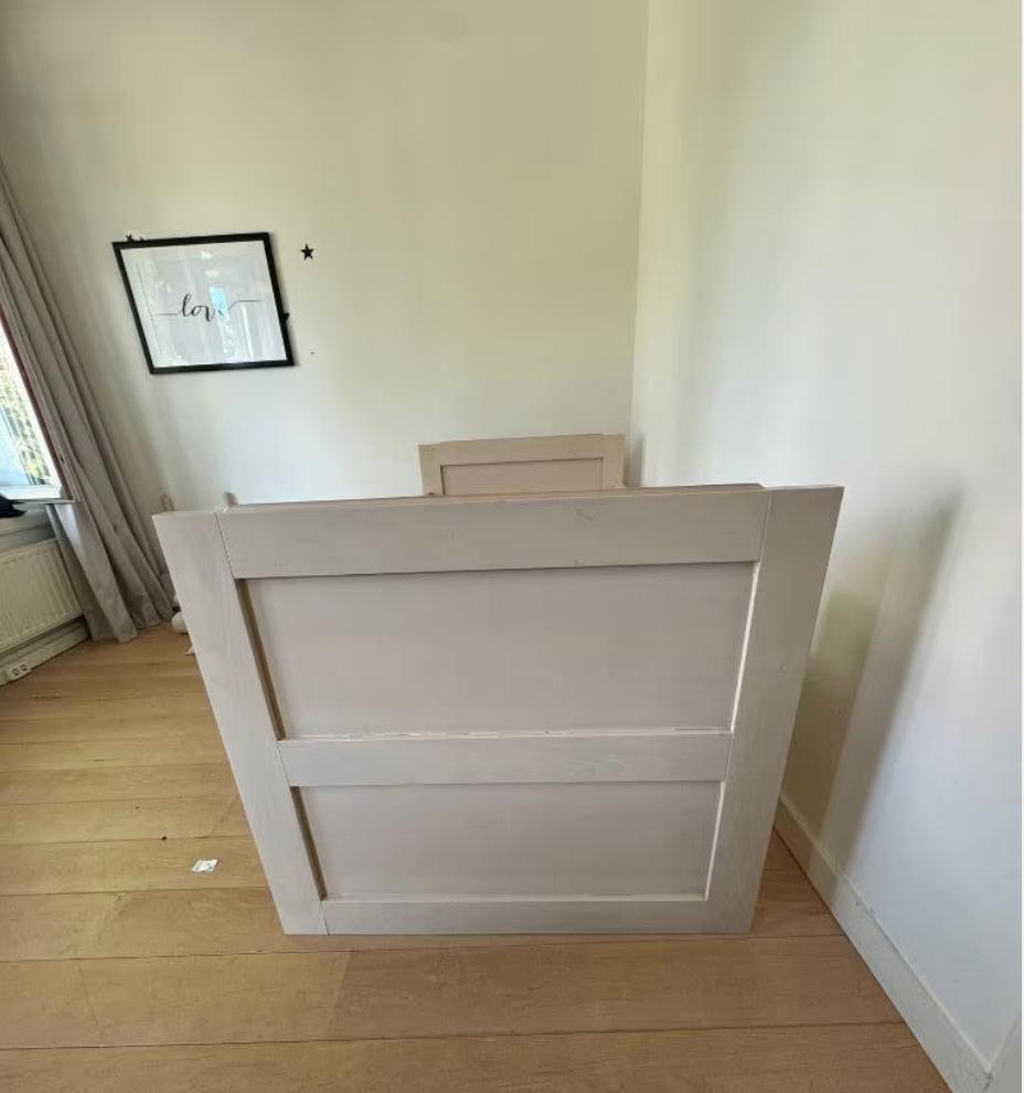 Dit 1-persoonsbed is nog in goede staat en gemakkelijk in- en uit elkaar te halen. Het frame komt inclusief de lattenbodem. Het bed is al uit elkaar gehaald en dient alleen opgehaald te worden. This s