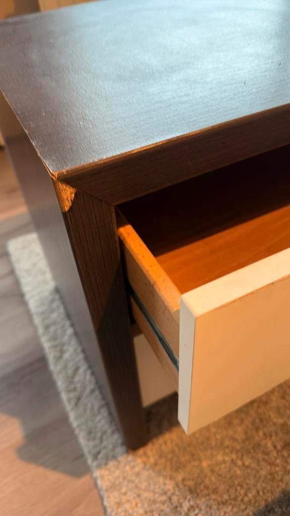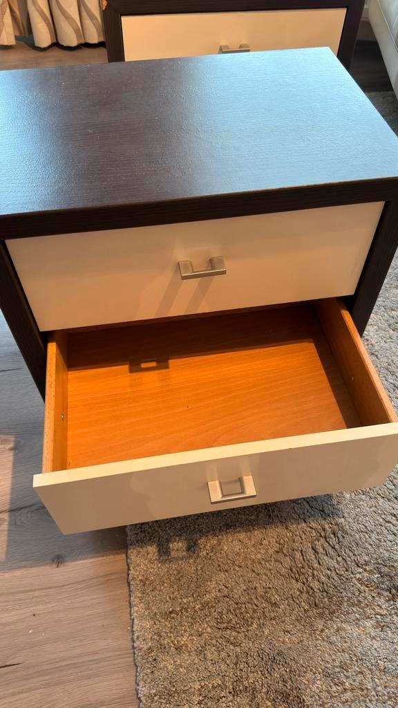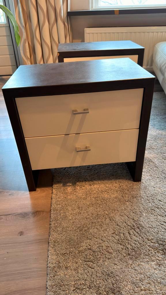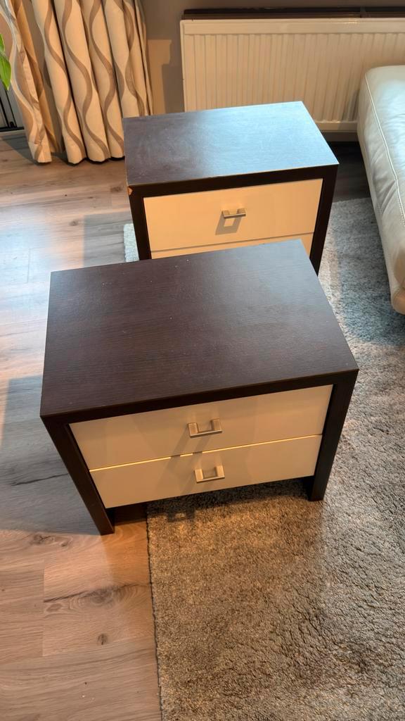 Set van 2 nachtkastjes in donkerbruin hout (wengé) met gebroken witte lades. Elk kastje heeft 2 lades en de afmetingen zijn 51,5 x 36 cm en 47 cm hoog. Gratis op te halen.