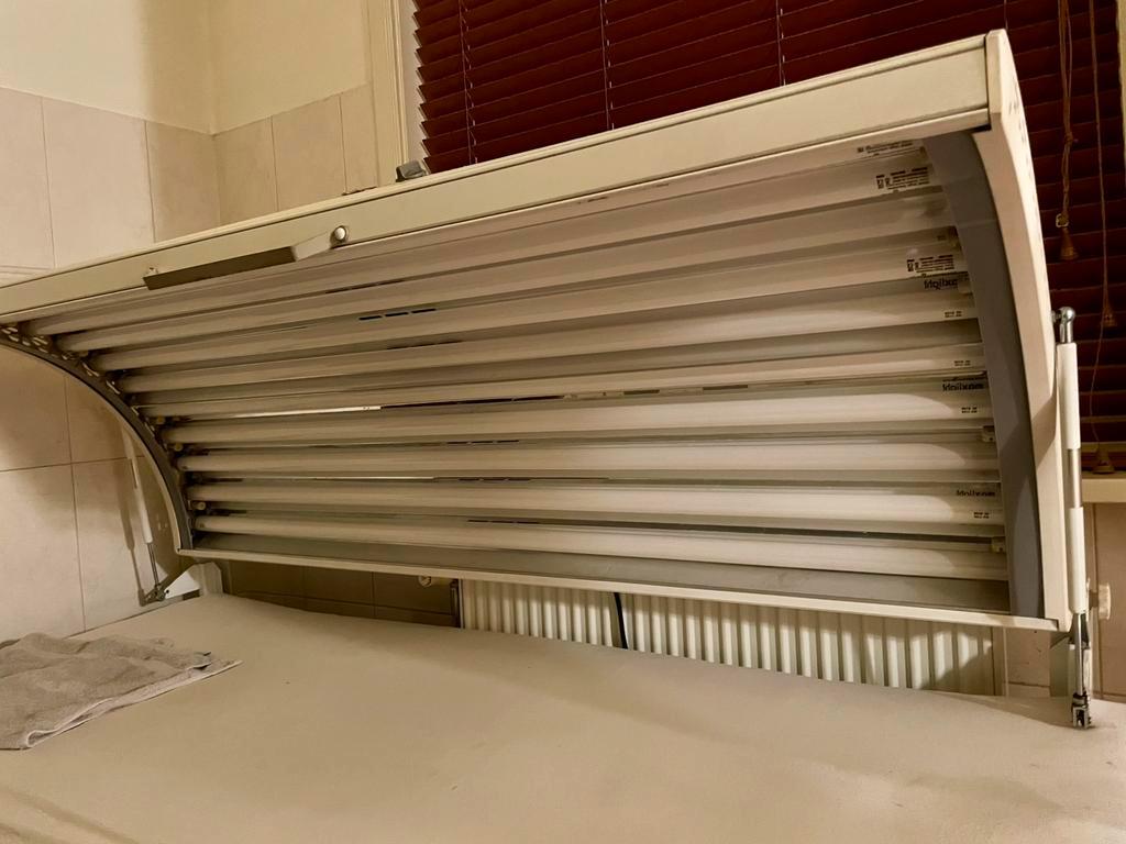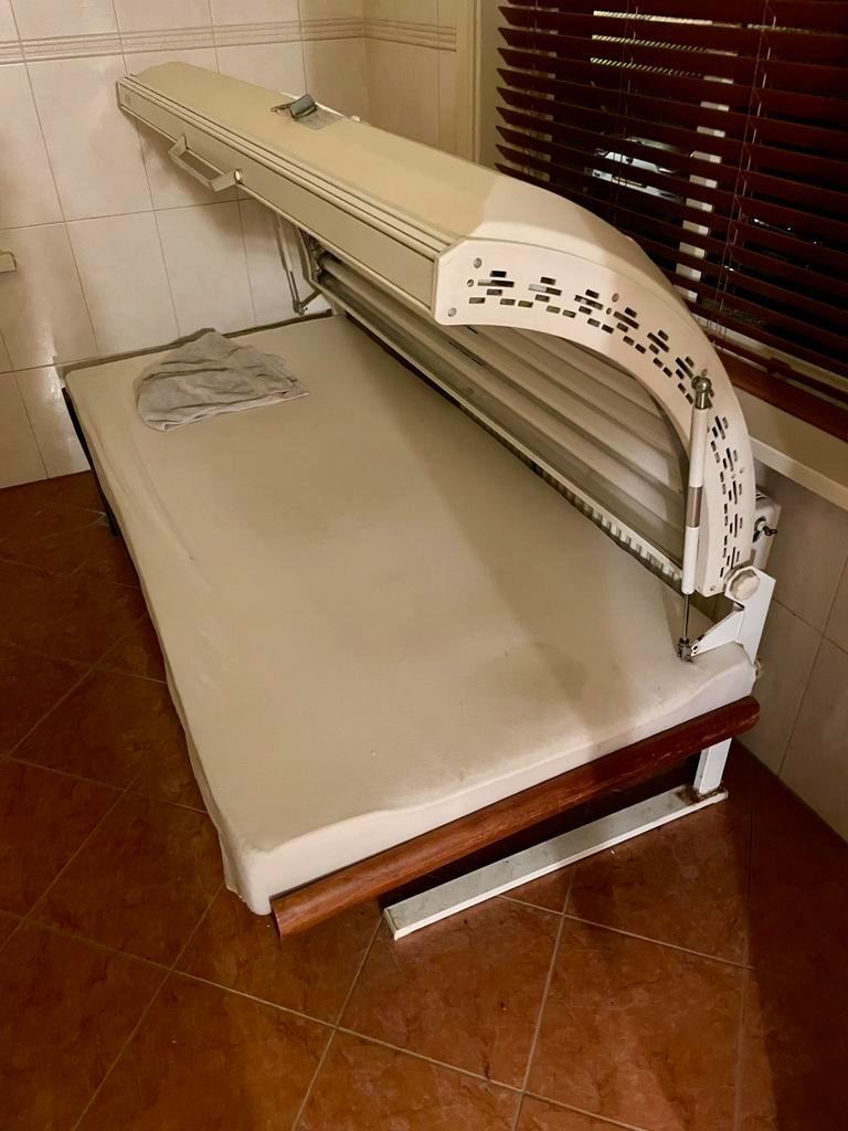 Gratis ophalen. Zonnehemel met 10 lampen. De lampen hebben nog veel brand/bruin uren te gaan. Instelbaar tot 30 min. (Het bed en matras op foto horen er nier bij)