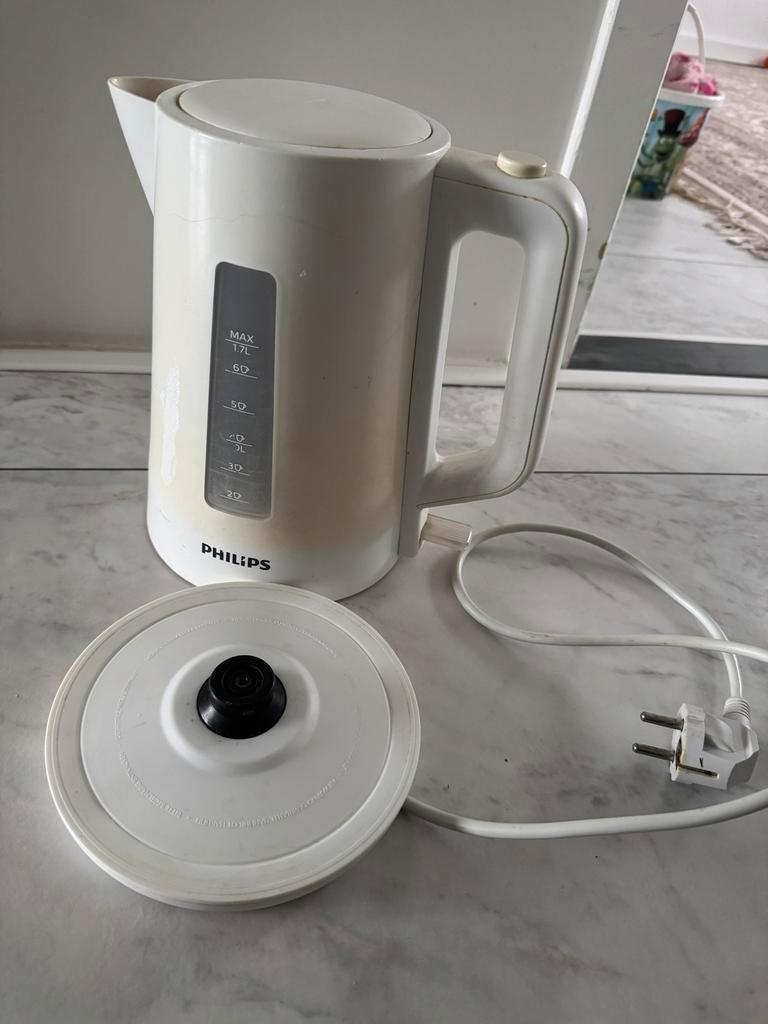 Gebruikte philips waterkoker. In goede staat, maar vertoont gebruikssporen. Ideaal voor snel water koken voor thee, koffie of andere warme dranken. Inhoud tussen 1 en 2 liter.