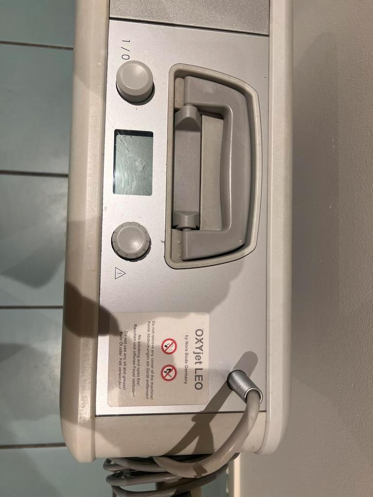 Apparaat om zuurstof in de huid te pulseren. Naam: oxyjet leo van nora bode. Moet gereviseerd worden. Pulst momenteel niet