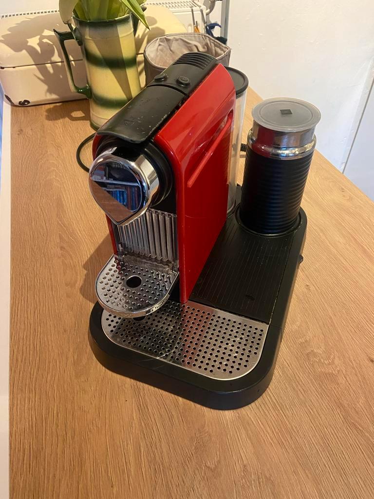 Nespresso apparaat met melkopschuimer te koop. Het apparaat werkt nog, maar heeft wel enkele defecten: de hendel om de cup te gebruiken vereist wat kracht, de knopjes bovenaan zijn moeilijk in te druk