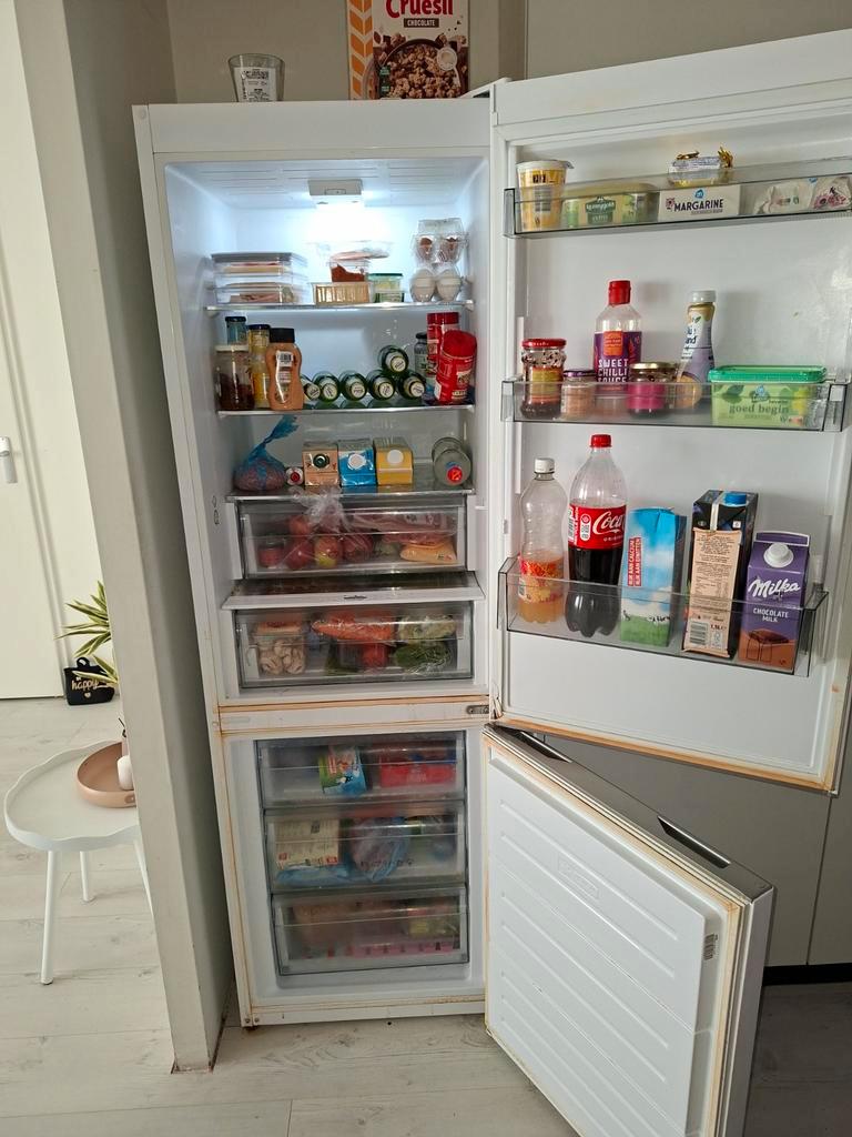 Zwolle stadshagen. Koelvriescombinatie 180 hoog en 59 breed. Geen idee hoeveel inhoud. Merk sharp. +/_ 8 jaar oud. Helaas begint rubber kapot te gaan zie foto! Waardoor die roest lekt. Eventueel door