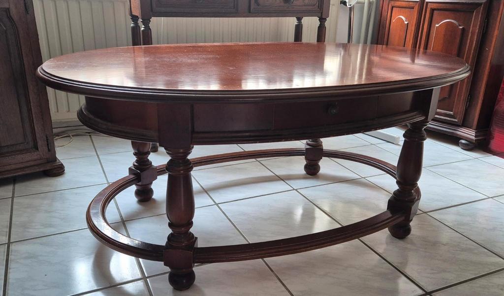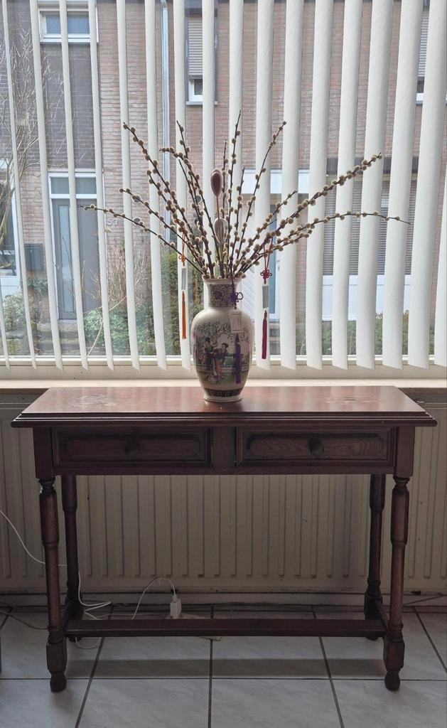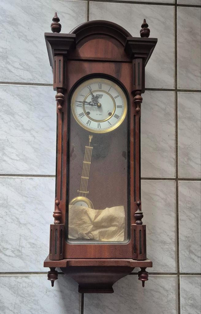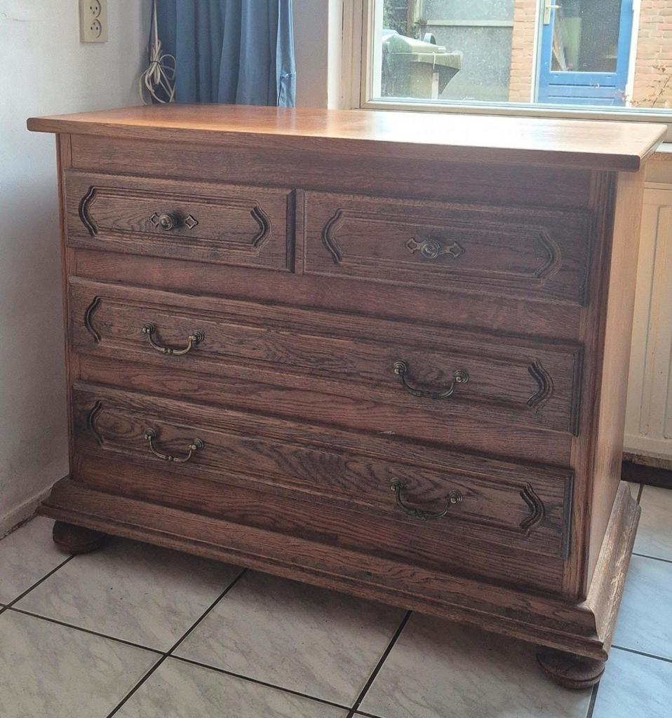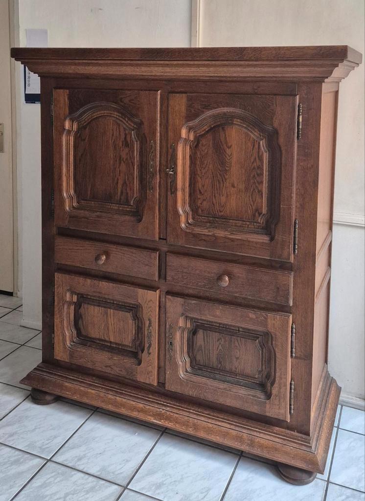 Gratis op te halen, diverse meubels, waaronder een houten kast met deuren en lades, een wandklok en een bijzettafel. De kast is ideaal voor het opbergen van spullen. De wandklok is een mooie decoratie