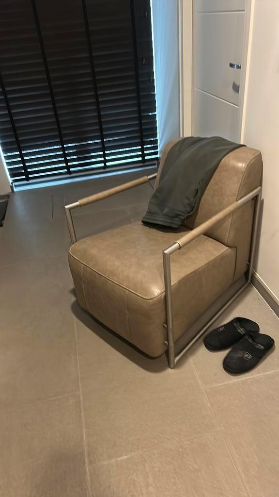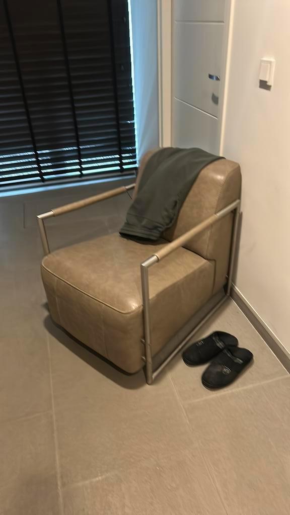 Twee comfortabele stoelen met een lederen zitting en een stevig metalen frame. De stoelen zijn gebruikt gratis afhalen