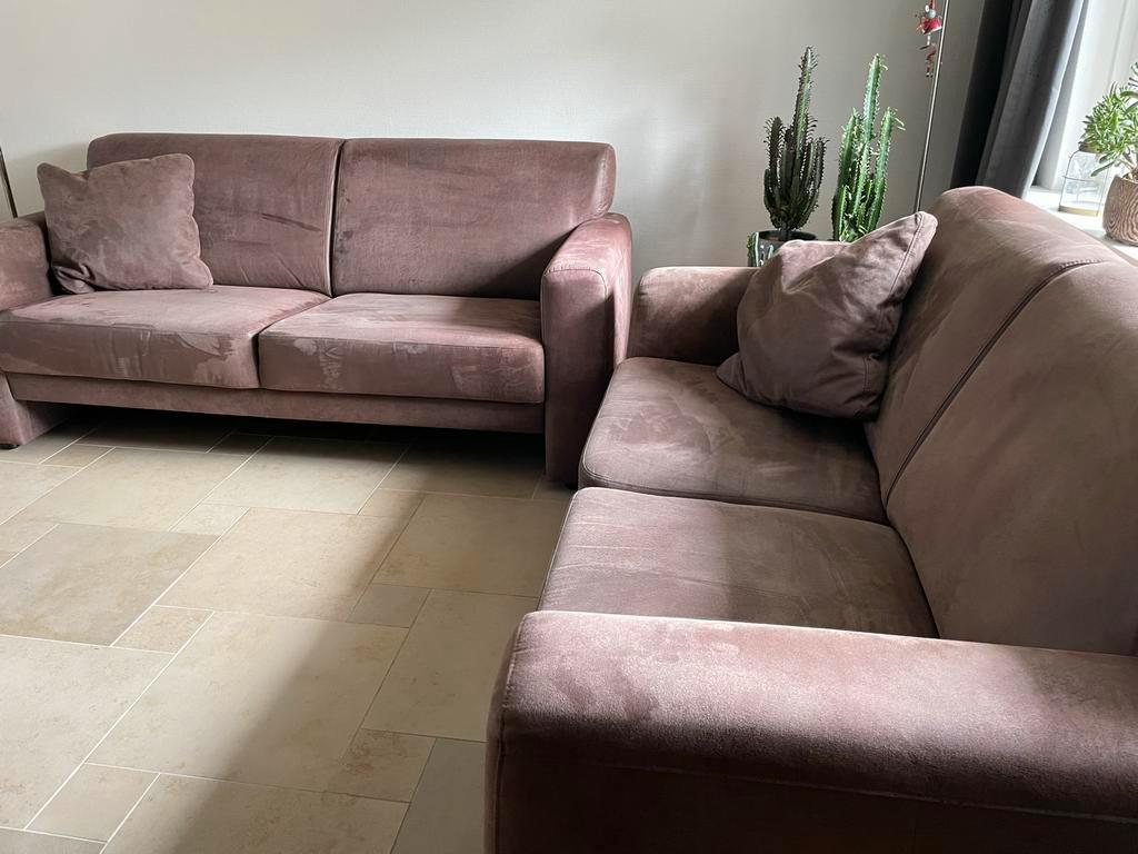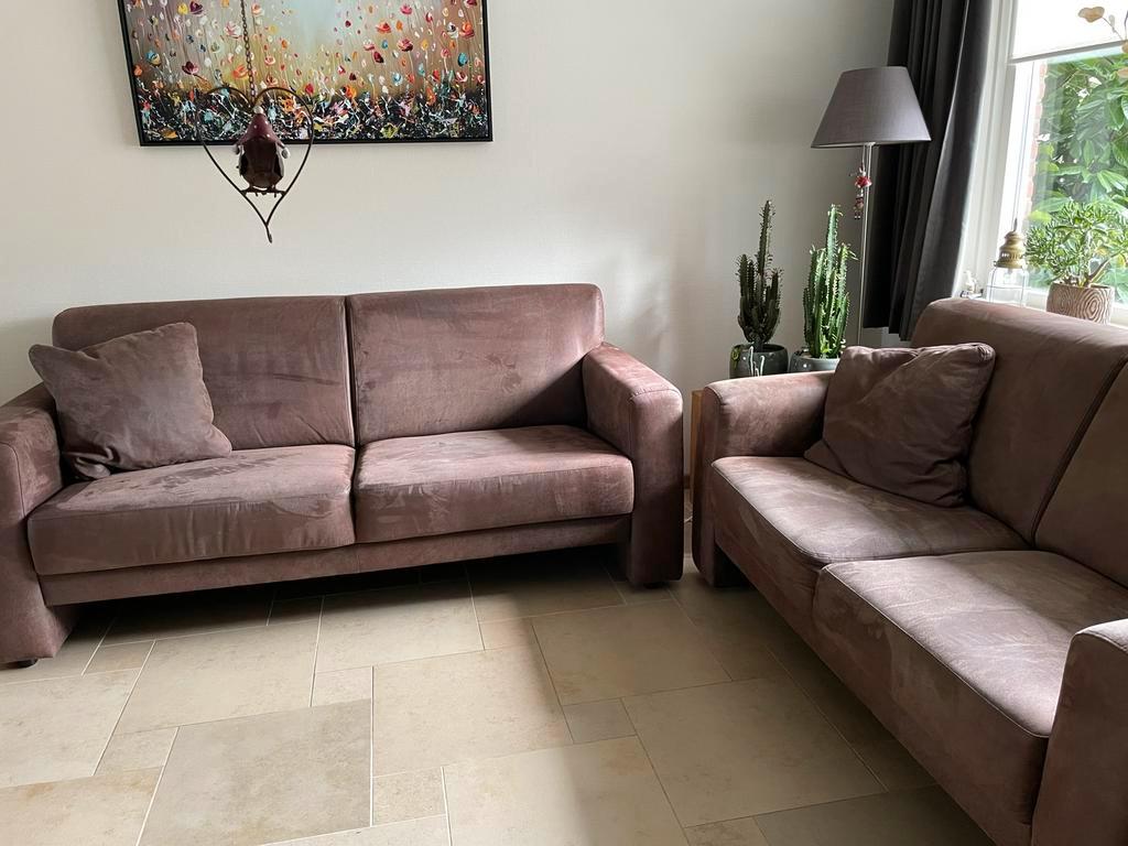 Mooi, donkerbruin eco-leren bankstel bestaande uit een 3-zits en een 2-zits bank. Inclusief bijpassende sierkussens. De 3-zitsbank is 190cm breed, 80cm diep en 90cm hoog. De 2-zitsbank is 165cm breed,