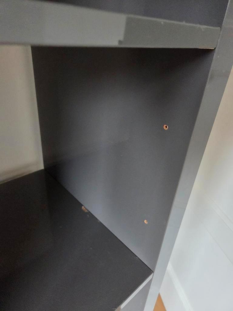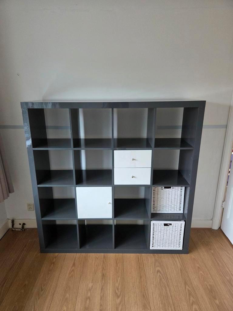 Grote grijze kast met veel vakken. De kast is in gebruikte staat, maar nog prima te gebruiken. Ideaal voor het opbergen van spullen in de woonkamer, slaapkamer of kinderkamer. De kast heeft zowel open
