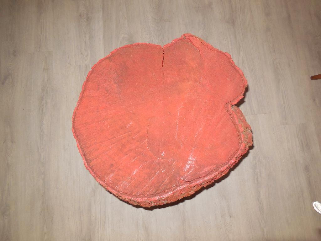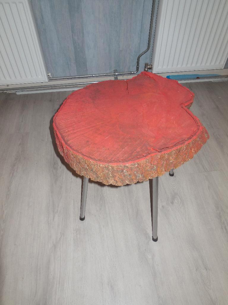 Geweldig bijzettafeltje/krukje van boomstam, handgemaakt gratis! Rood gespoten, maar kan uiteraard in elke gewenste kleur overgespoten worden. Onderstel is van de bekende formicastoeltjes uit de jaren