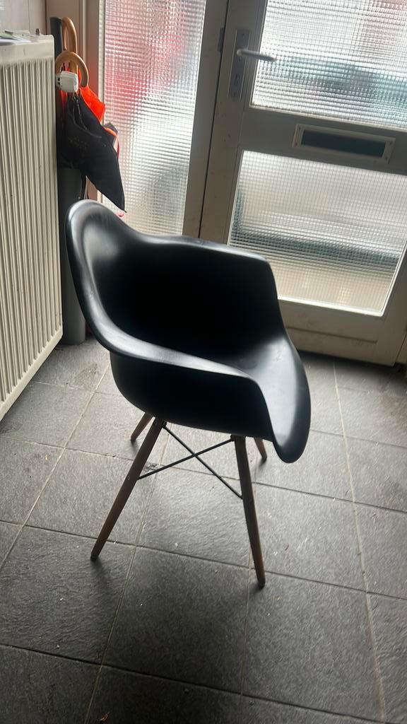 Zwarte stoel met houten poten. De stoel is in prima staat en kan direct gebruikt worden. Ideaal voor in de woonkamer, slaapkamer of studeerkamer.