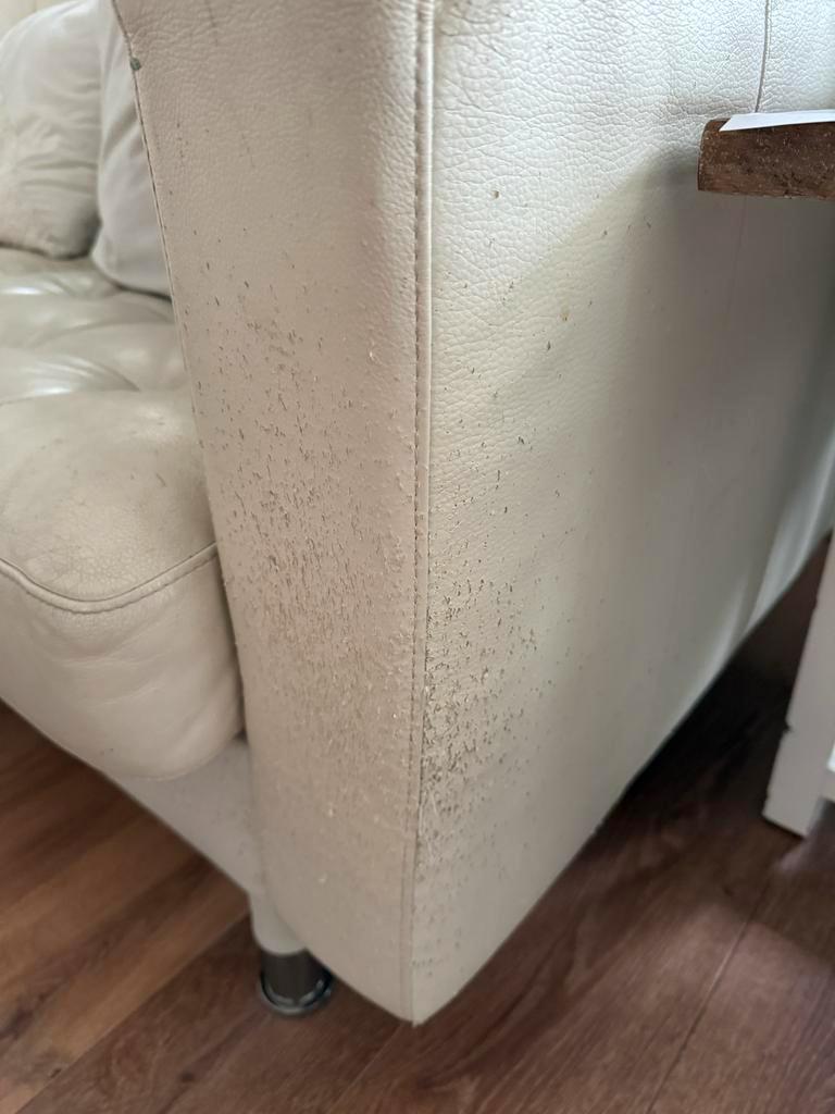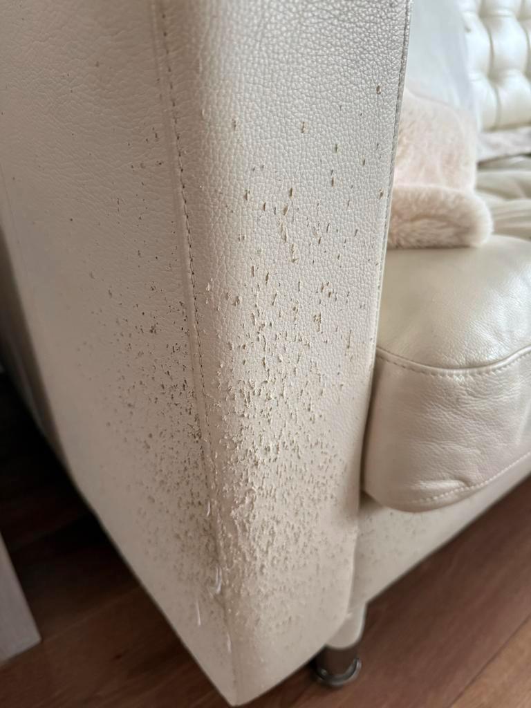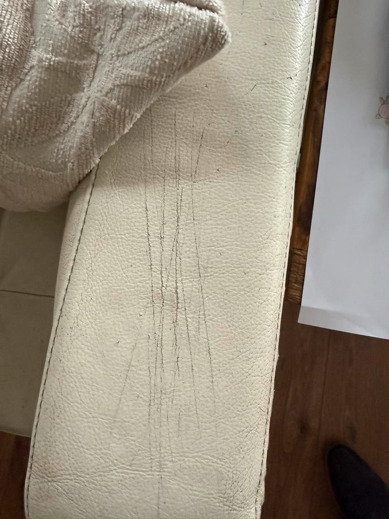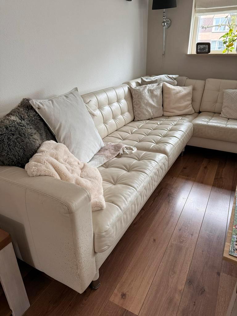 Witte leren hoekbank. Biedt comfort en stijl. Gebruikssporen aanwezig, zie foto''s. Perfect voor een gezellige zithoek. Ruime afmetingen voor meerdere personen. Helaas heeft de kat op de hoeken bes