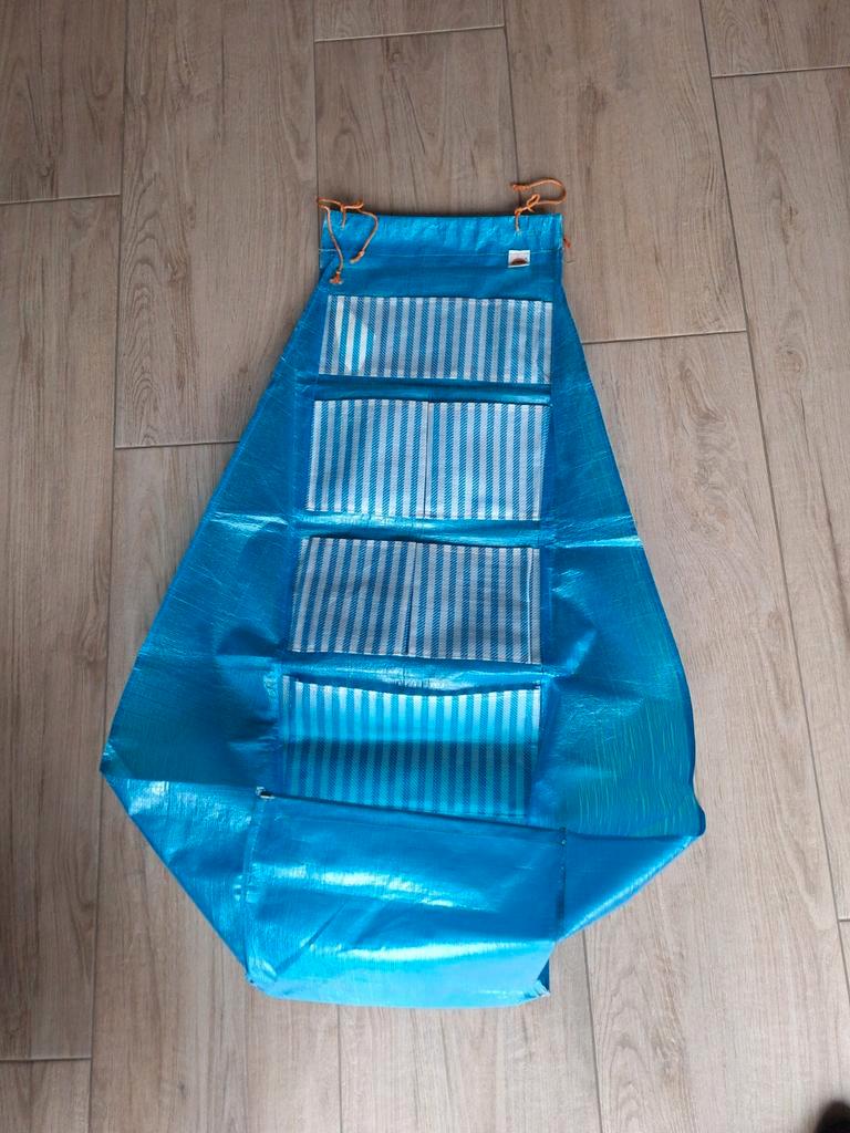Blauwe opbergzak met meerdere vakken. Ideaal voor het opbergen van spullen in huis, de garage of op de camping. De zak is gemaakt van stevig materiaal en kan makkelijk worden opgehangen.