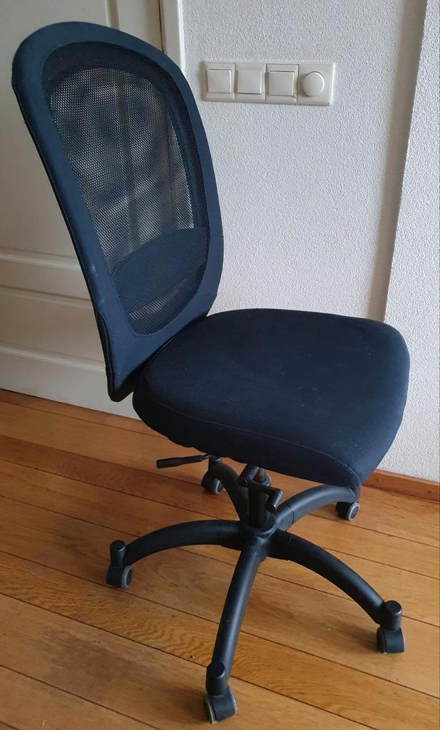 Comfortabele zwarte bureaustoel met een ademende mesh rugleuning. Ideaal voor thuiswerken of studeren. In gebruikte, maar goede staat. Verstelbare hoogte. Zwenkwielen voor makkelijke verplaatsing. Gra