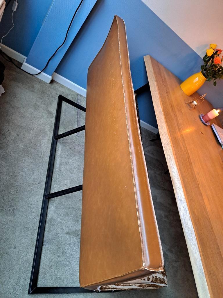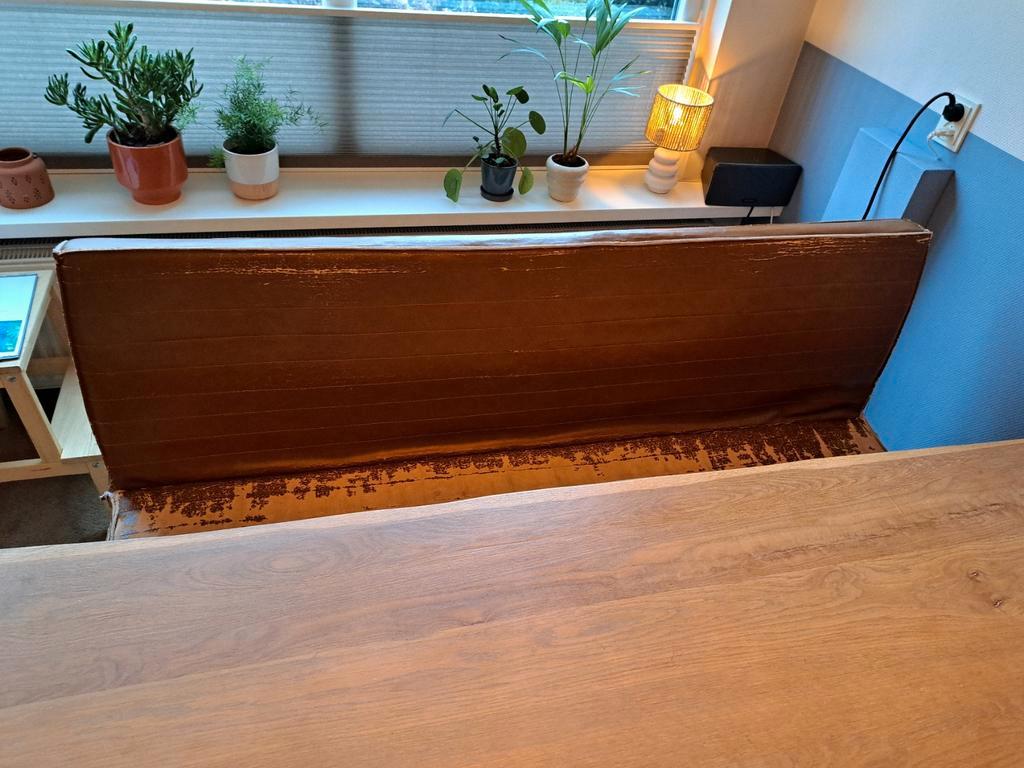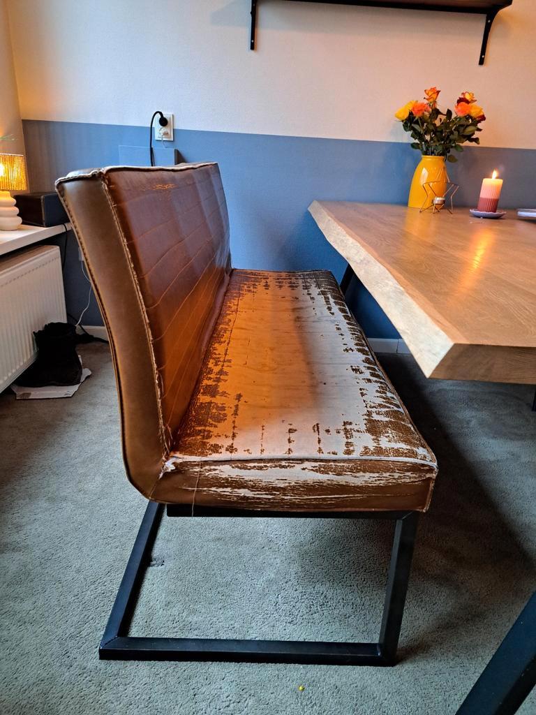 Eetkamerbank in gebruikte staat. De bank is 160 cm breed, 60 cm diep en 90 cm hoog. De zithoogte is 48 cm. Ideaal voor een gezellige eethoek, maar heeft wel gebruikssporen.