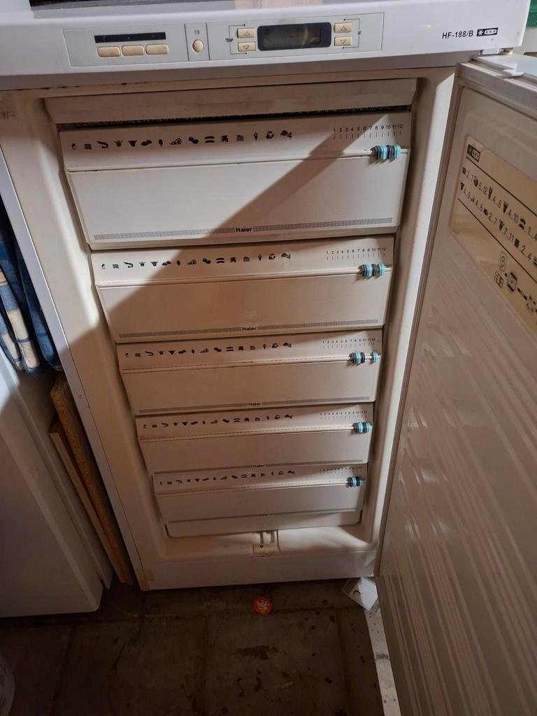 Grote vriezer te koop. De knoppen werken niet meer, dus hij kan alleen aan of uit. Hij vriest wel goed tot -19 graden. Afmetingen: 114cm hoog, 60cm breed, 60cm diep. Ideaal voor extra vriesruimte.