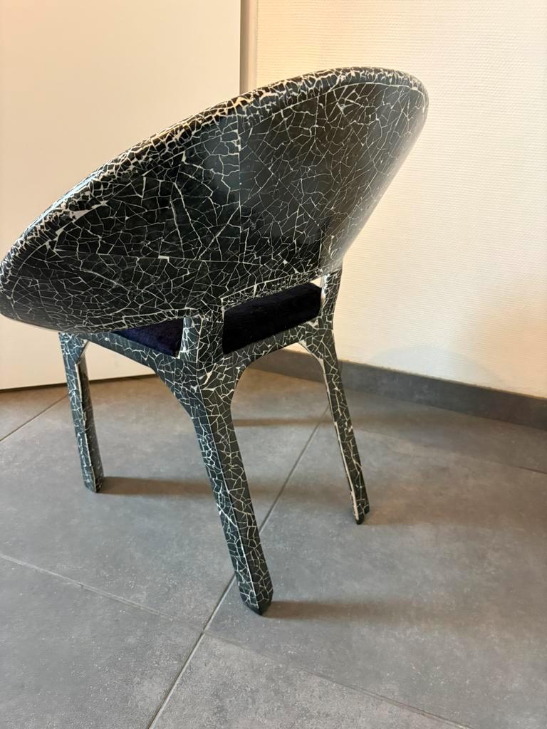 Stevige, decoratieve mozaïek stoeltjes. Twee stuks (van 1 exemplaar is het kussen licht verkleurd). Overbodig wegens verhuizing.