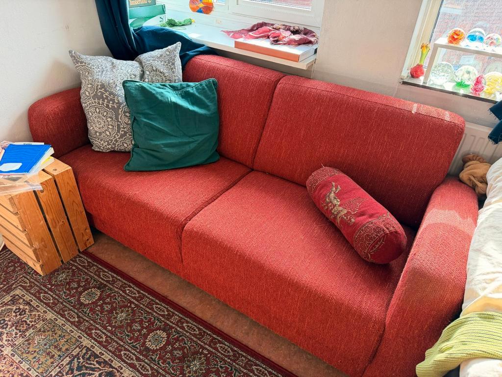 Gratis rode bank! Deze comfortabele bank is perfect om op te relaxen. De bank is gebruikt, maar nog in goede staat. Ideaal voor een studentenkamer of als extra zitplek. Gratis af te halen!