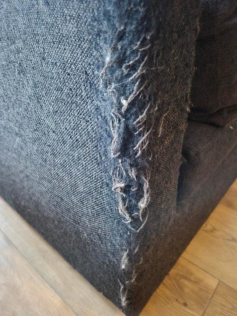 Grote comfortable hoekbank. Wel met flinke gebruikssporen dankzij onze katten. Hij is door hen als krabpaal en bed gebruikt. Dus je moet tegen wat achtergebleven haar kunnen (hij is wel grondig stof g
