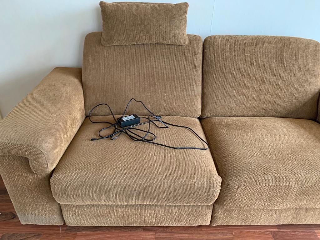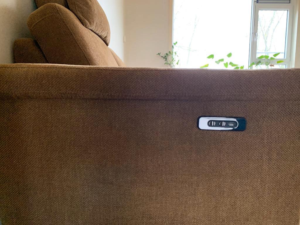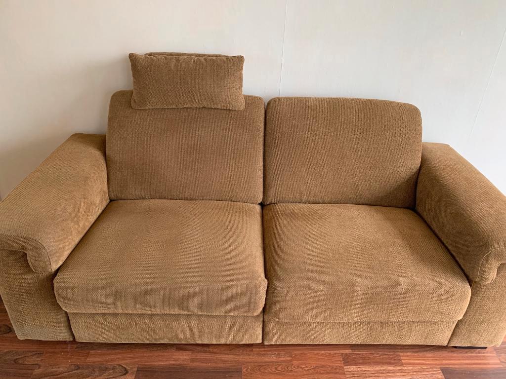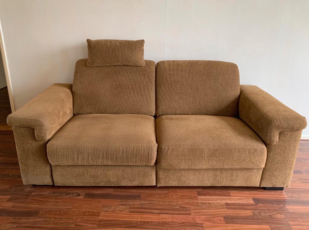 Ruime tweezits bank, kleur "roest" bruin, verstelbaar, met usb-aansluiting, met te verwijderen hoofdsteun, ongeveer 3-4 jaar oud. Gratis en zelf af te halen/vervoeren.