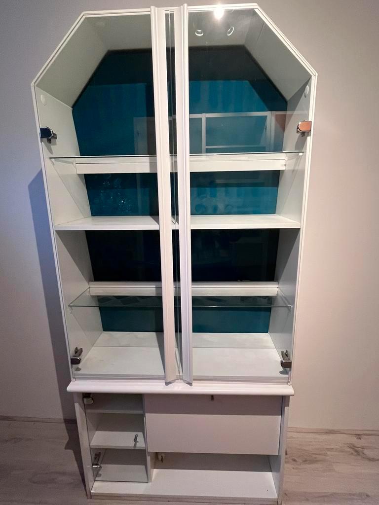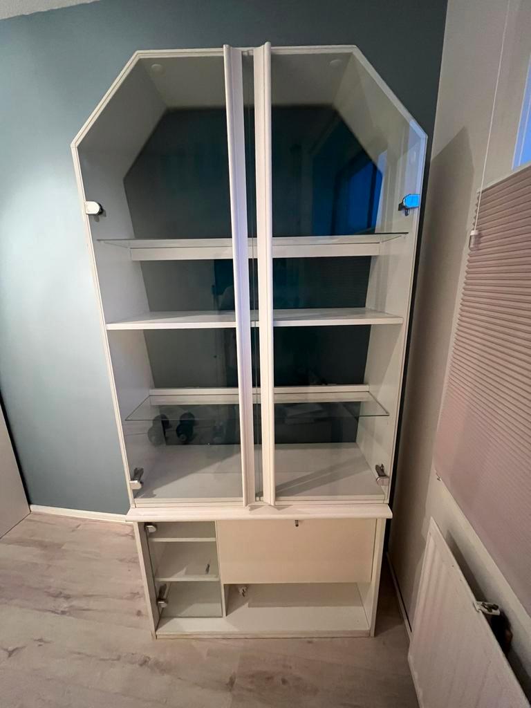 Gratis af te halen witte vitrinekast. 190 Hoog 90 breed 36 diep de groene achterwand zit los en kan eruit. Kast is in 2 delen