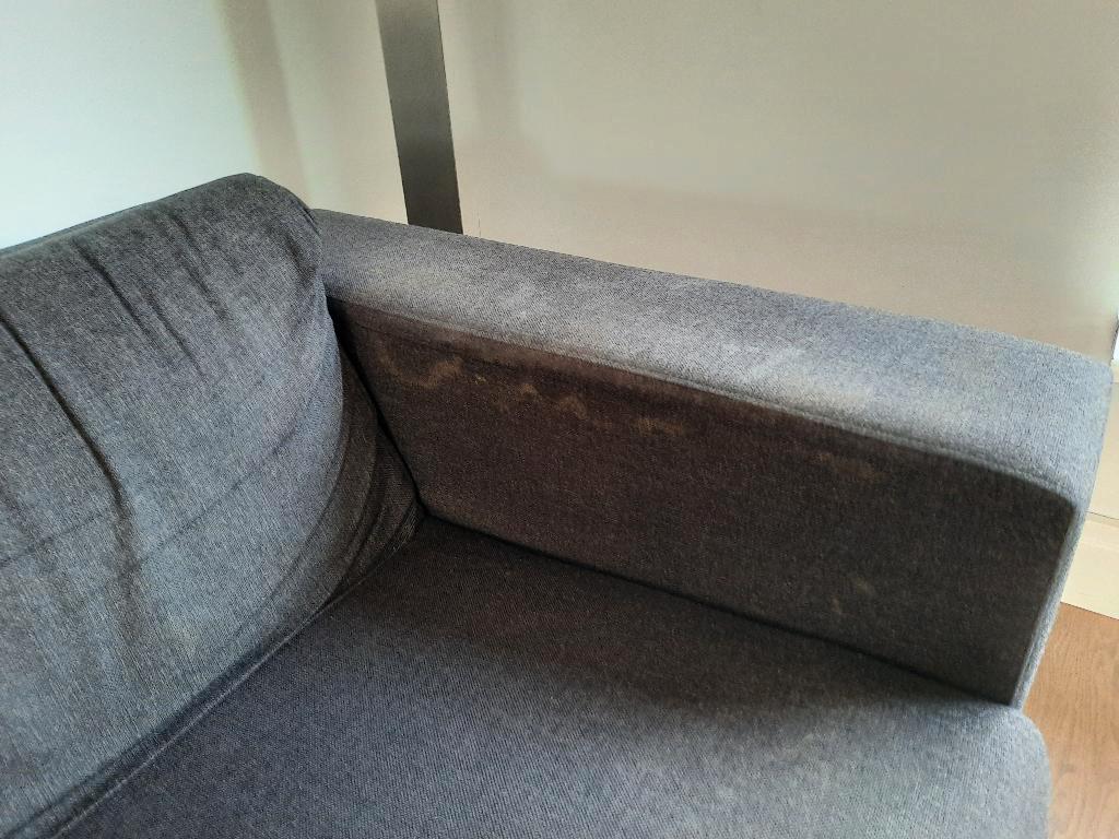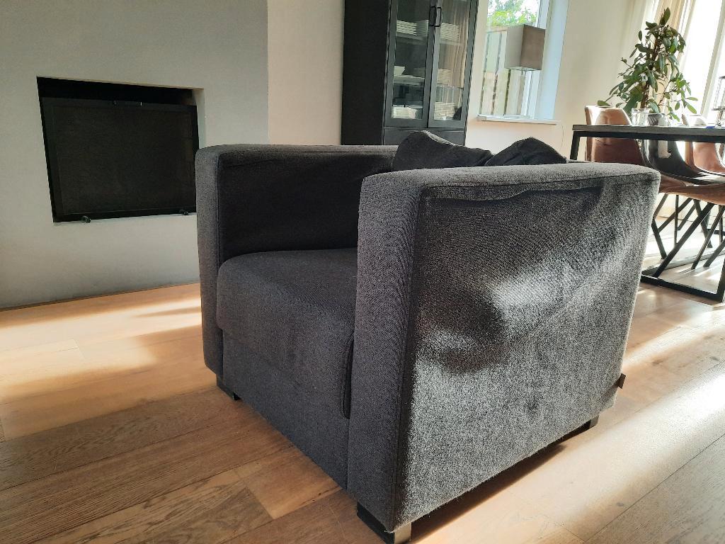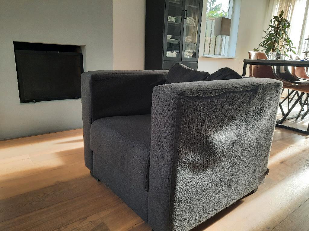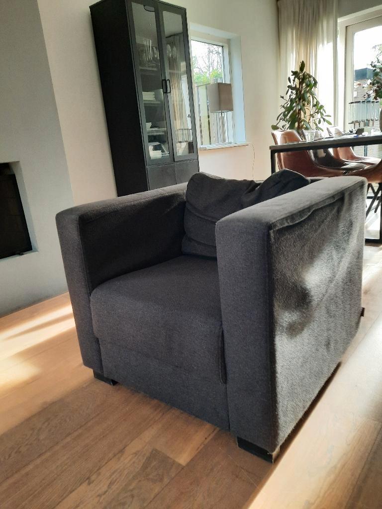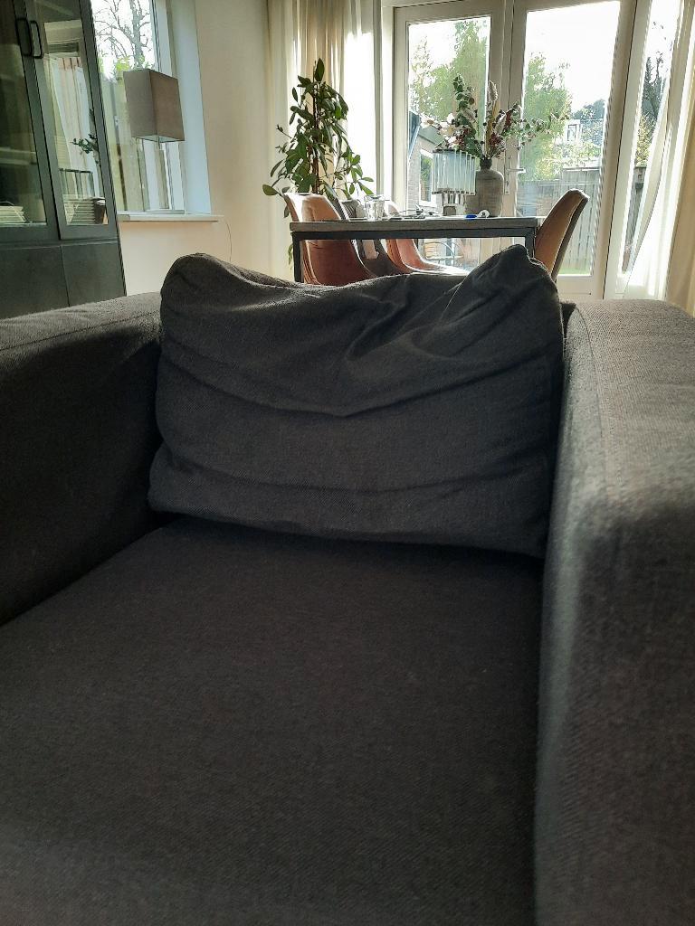 een gebruikte (ruim 13 jaar) bank en fauteuil in een donkergrijze kleur. Er is sprake van gebruiksporen en de kussens van de rugleuning zijn wat doorgezakt. Hij zit en ligt nog erg lekker.