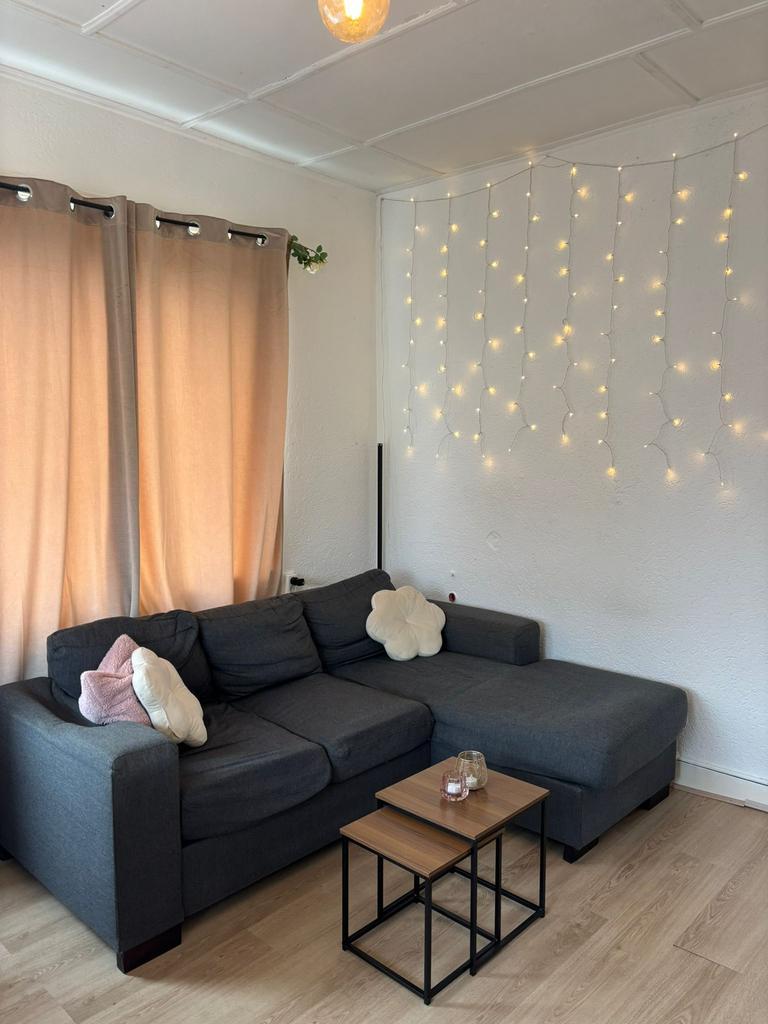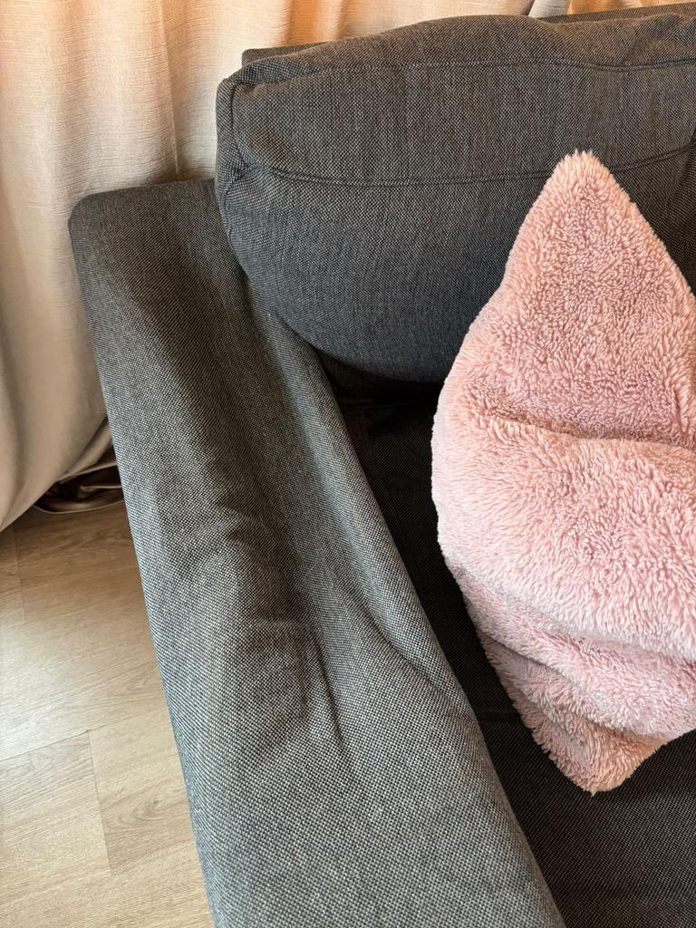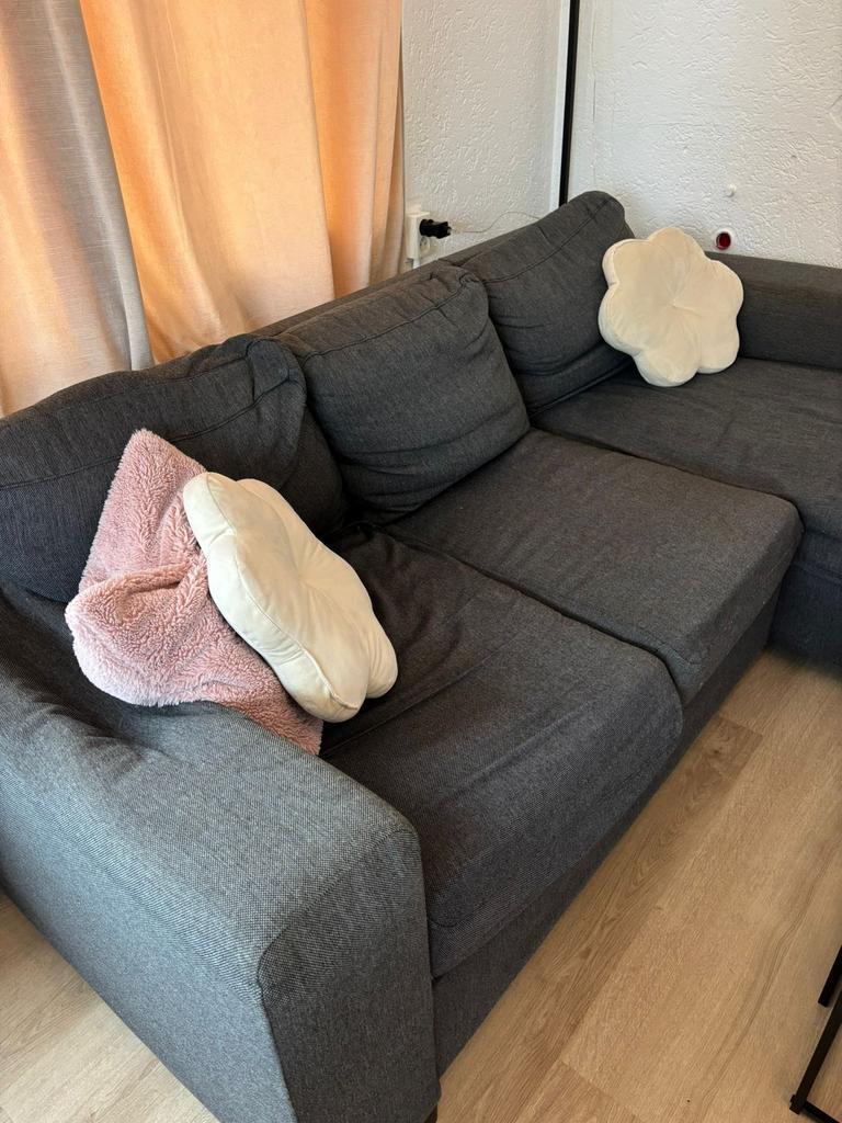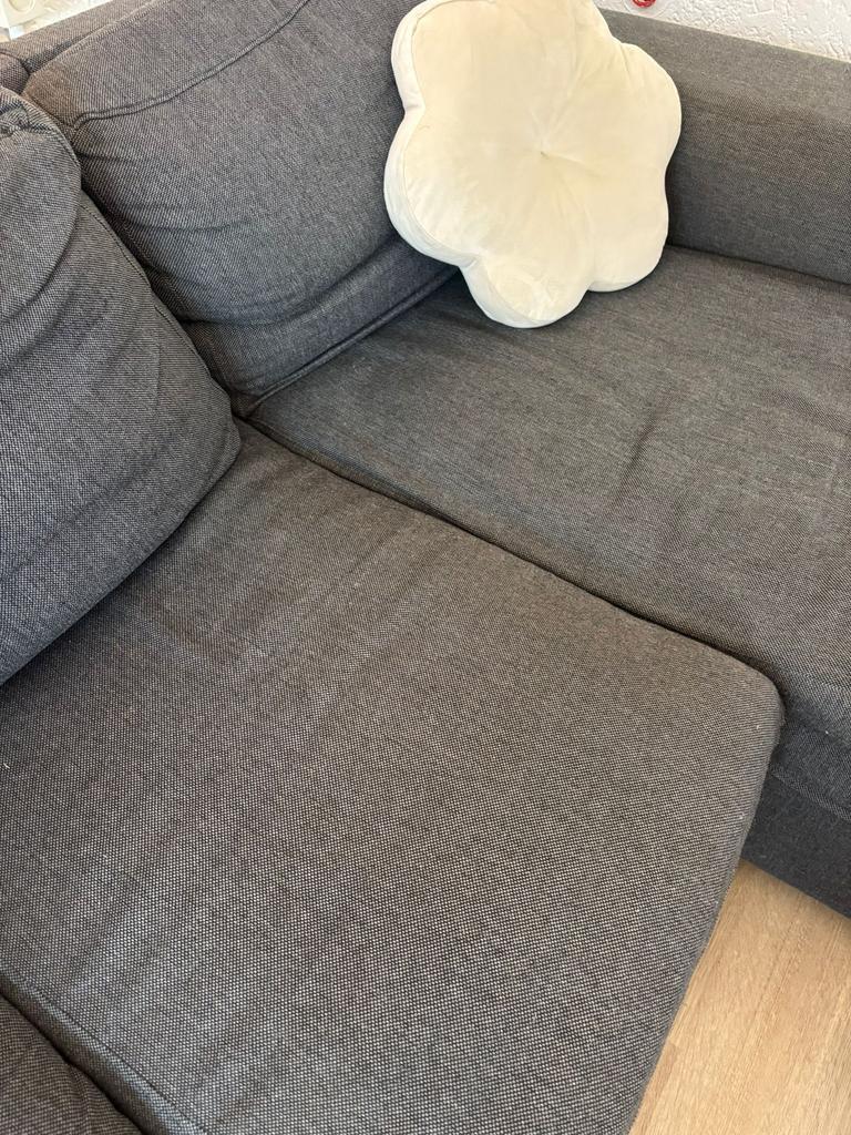 Een grijze hoekbank met de afmetingen 210x150. De armleuning is doorgezakt, zoals te zien is op de foto. Ook zijn de ritsen van de zitkussens los gegaan in de wasmachine. Mogelijk is dit nog wel te ma