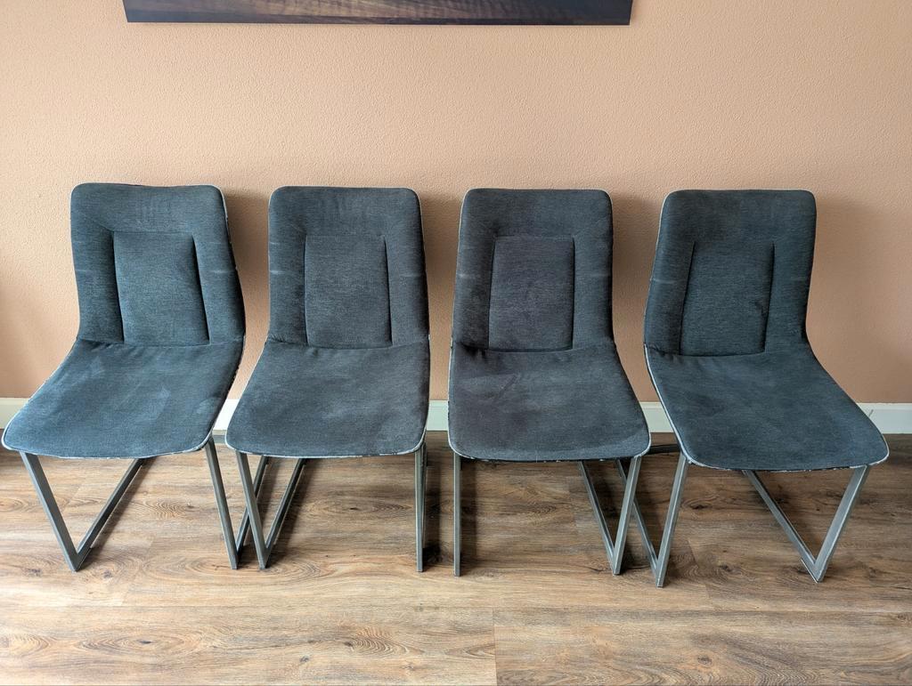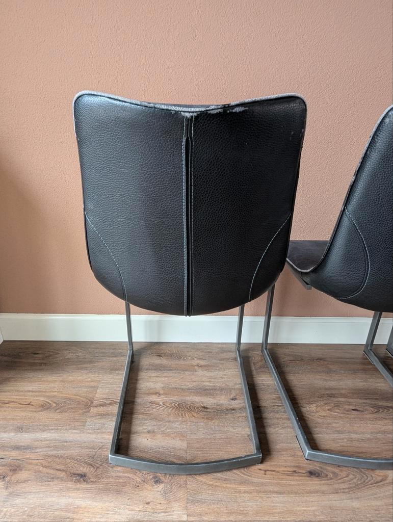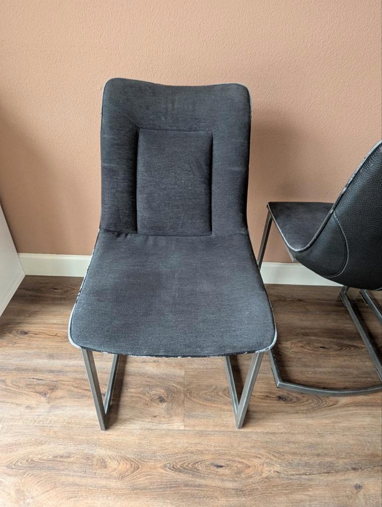 Gratis, set van 4 zwart/antraciete eetkamerstoelen met metalen poten. De stoelen zijn bekleed met stof en aan de achterzijde leather look. Leather look laat iets los bij de randen en bovenin ( zie fot