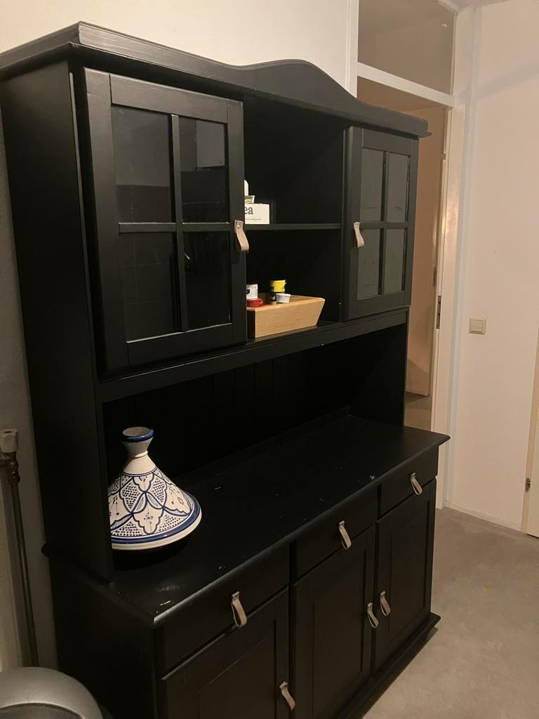 Zwart geverfde buffetkast met glazen deuren