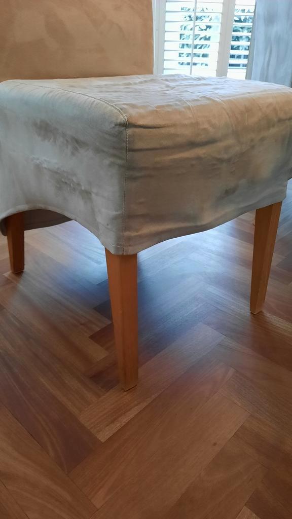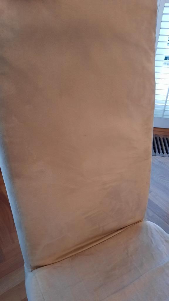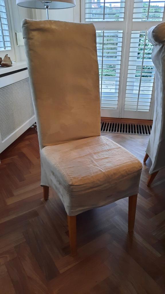Set van 6 eetkamerstoelen. 110 Cm hoog, met rugleuning van 65 cm hoog. Zitvlak 44 cm breed en 43 cm diep. Comfortabele beige stoffen bekleding. Gebruikt. Verkoop i.v.m. Verhuizing. Uiterlijk 19 februa