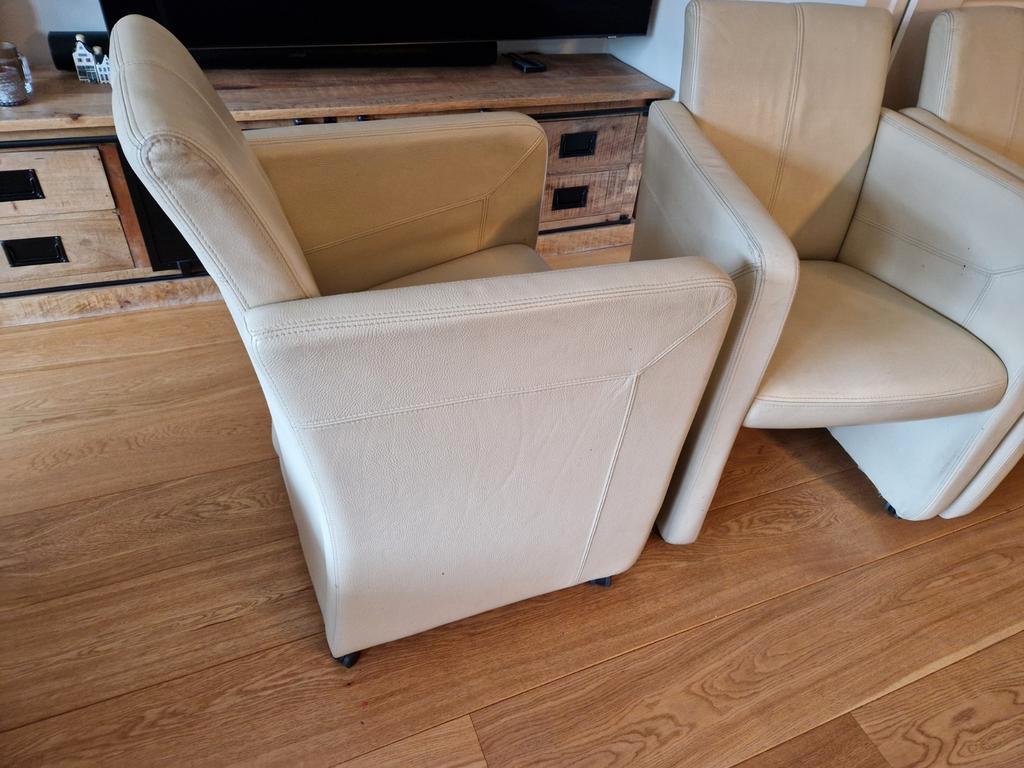 Set van zes leren eetkamerstoelen met wieltjes. Zijn niet nieuw, hebben gebruikerssporen maar zitten nog heel comfortabel. Gratis ophalen!