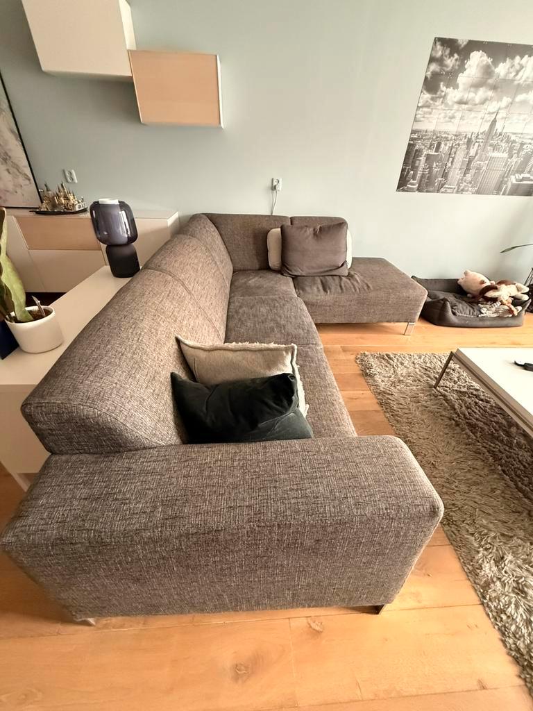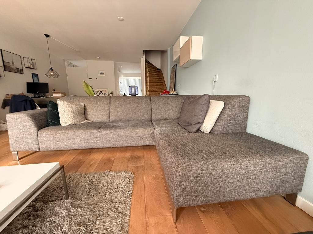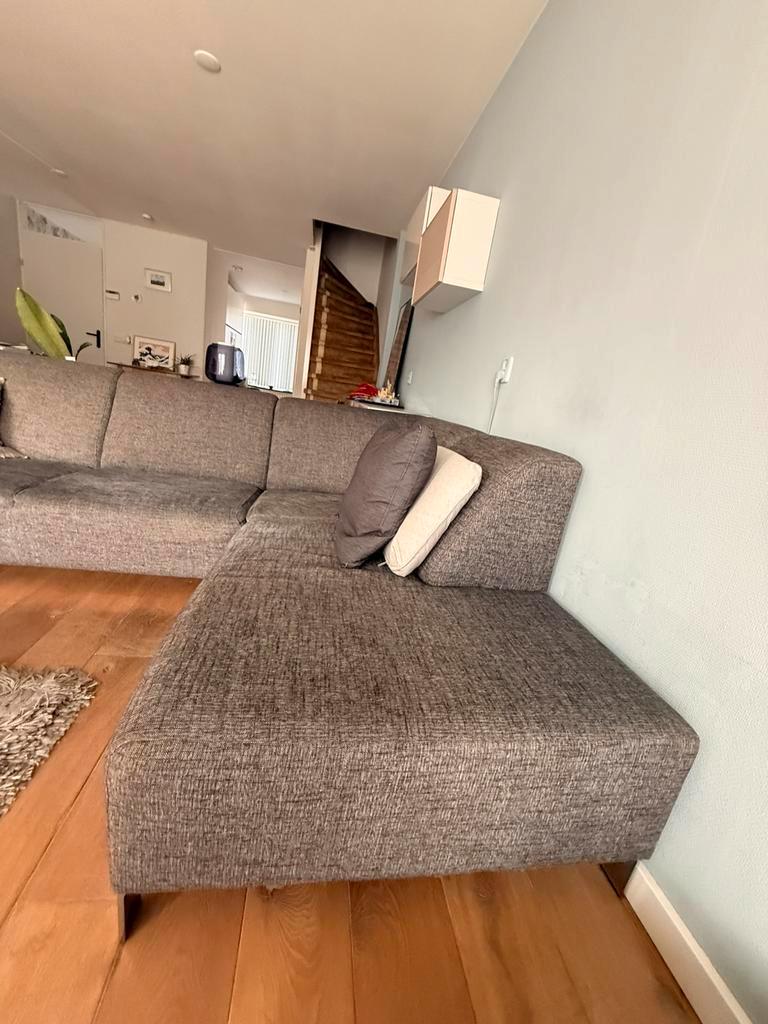 Hoekbank , ongeveer 10 jaar oud maar zit nog goed. Ivm verhuizing mag ie gratis weg! Bestaat uit 2 stukken lengte ongeveer 275cm breedte zitgedeelte ongeveer 57 cm loungegedeelte is 90 cm breed en 160