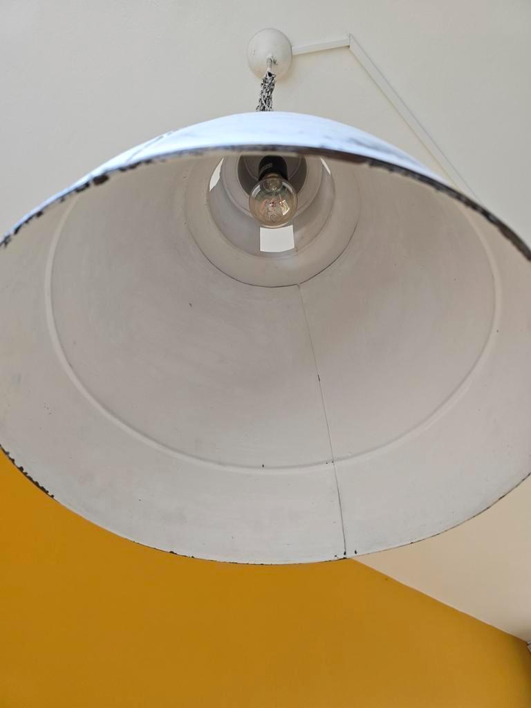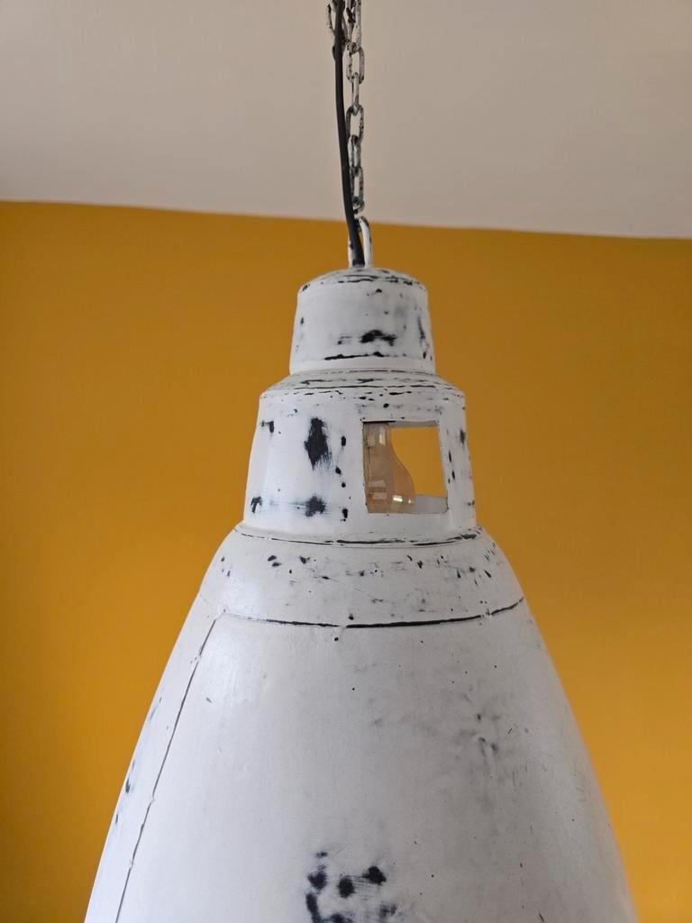 Stoere industriële hanglamp. Geeft een mooi licht en past goed in een modern of industrieel interieur. De lamp is gemaakt van metaal en heeft een witte kleur met gebruikssporen voor een authentieke lo
