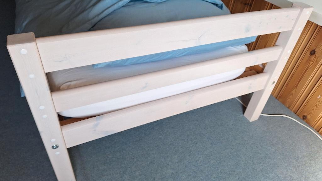 Gratis af te halen. Een persoons bed van hout, met white wash. Maat: 90 x 200. Is al uit elkaar gehaald. Kan zo mee.