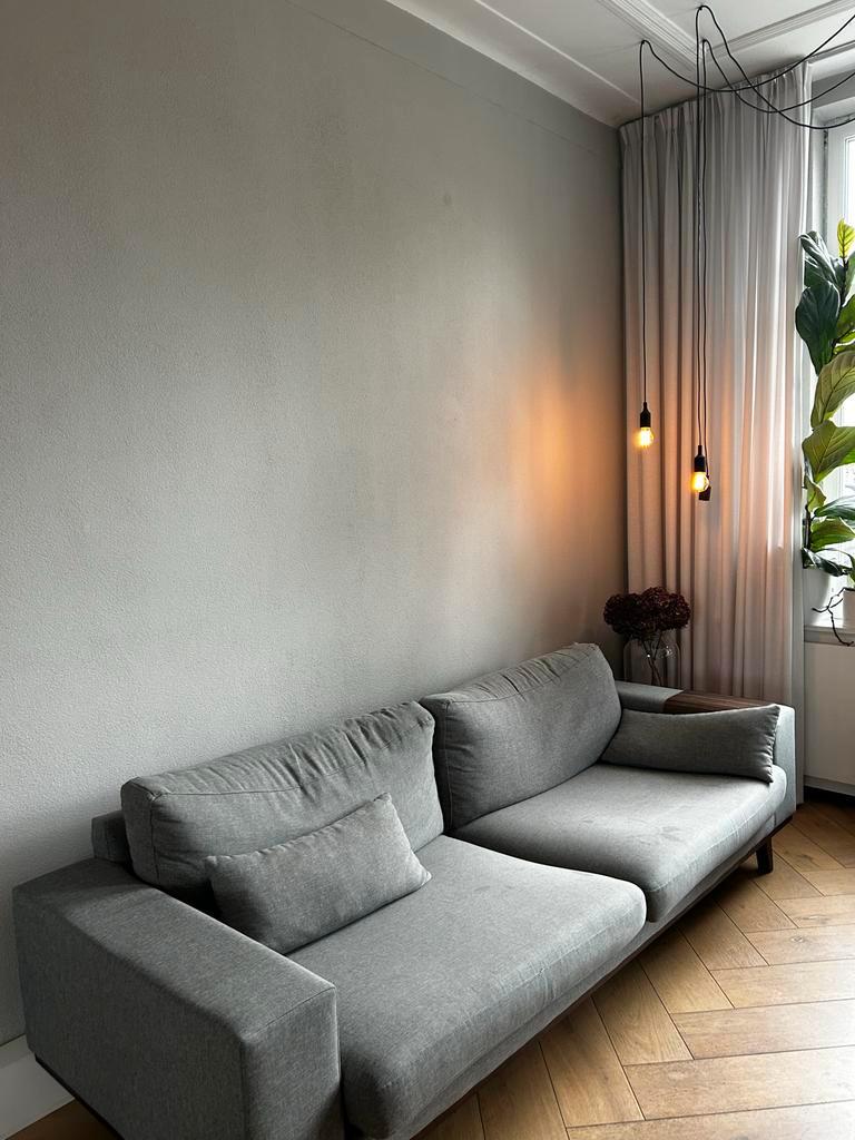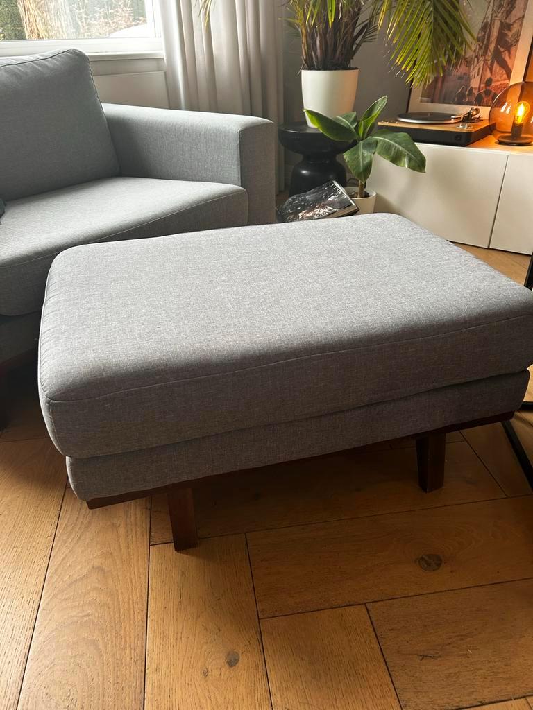 Complete grijze bank set van wehkamp, bestaande uit een bank, loveseat en hocker. De set heeft een moderne japandi uitstraling met houten walnootpoten. Alle hoezen zijn afneembaar en wasbaar, ideaal v