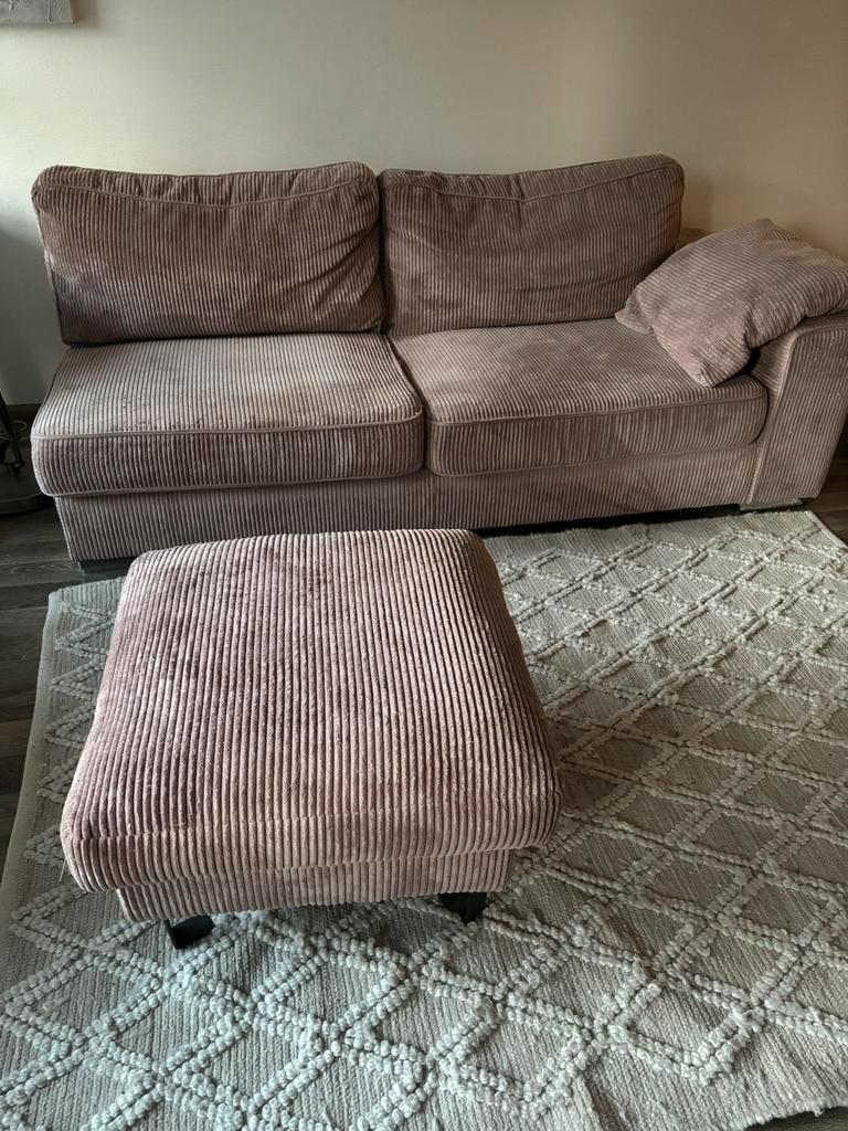Gebruikte rose bank, maar nog in goede staat voor een tweede ronde. Inclusief bijpassende hocker. Ideaal als set te gebruiken. Dit is een deel van een hoekbank, aan 1 zijkant is de bank een stukje gri