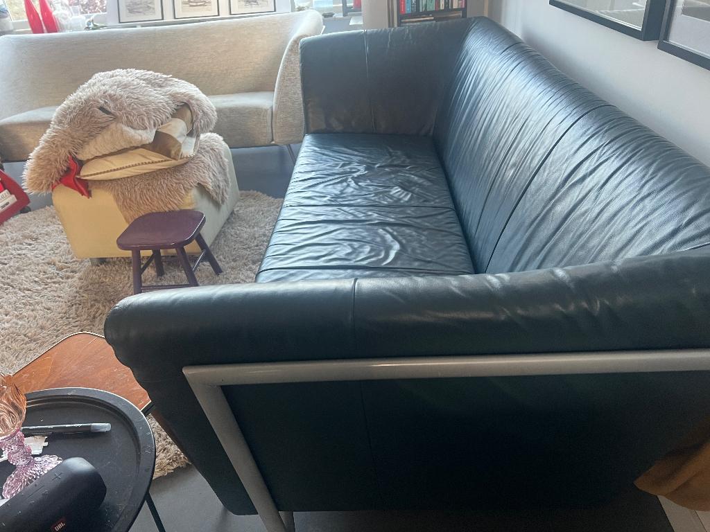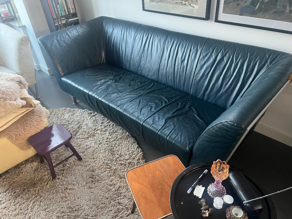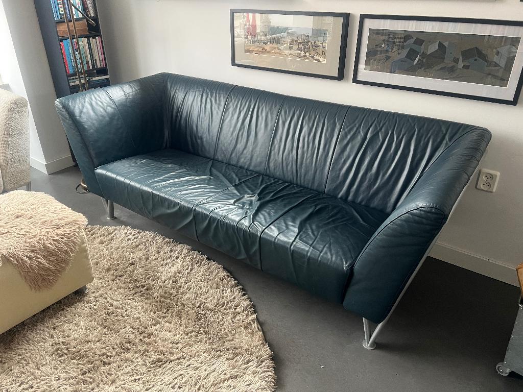 Model jazz, de 2,5 zitter van 2 meter breed. Donkerblauwe lederen bekleding, geen beschadigingen. Leuk ding, moet weg vanwege aanschaf nieuwe bankjes. Gratis ophalen. Z.s.m. Anders gaat ie naar de sto